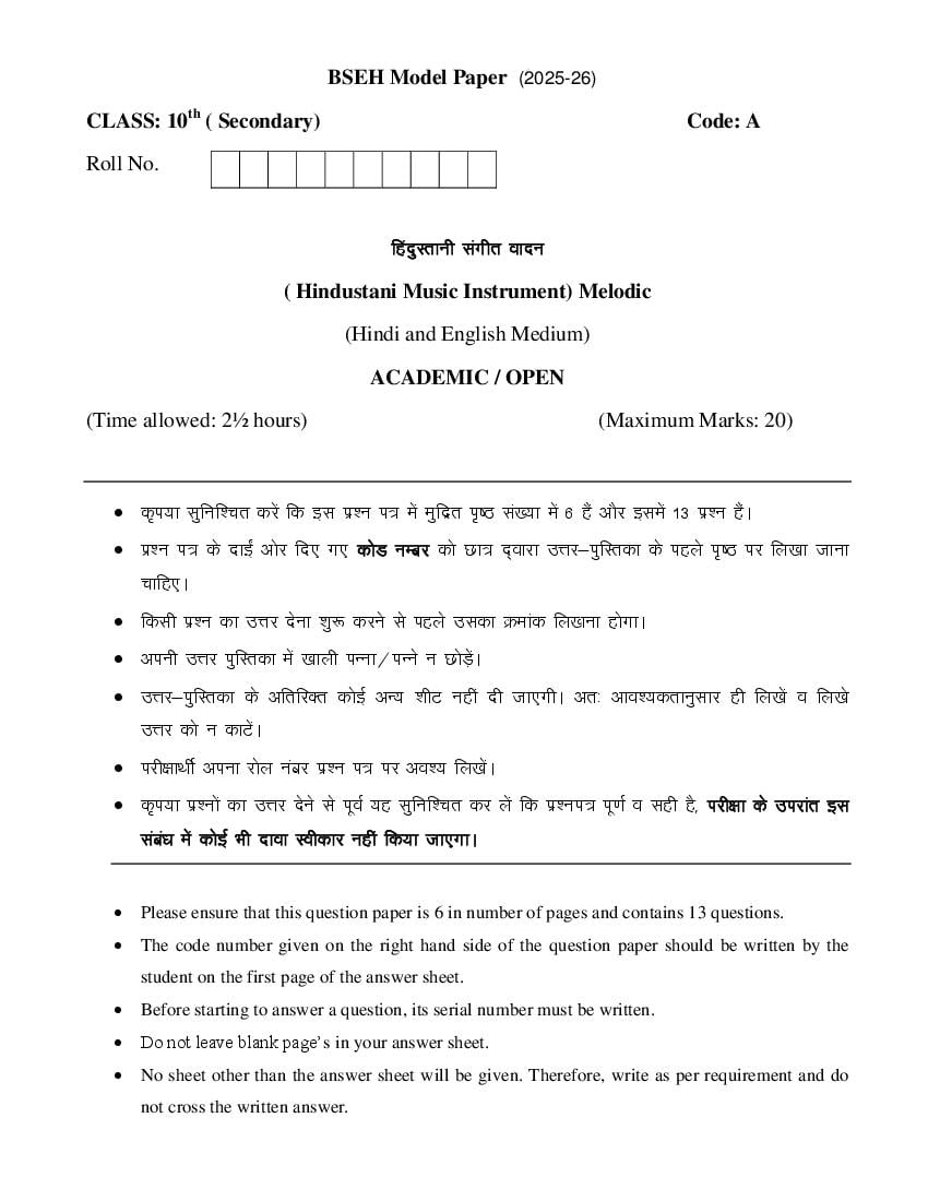 HBSE Class 10 Hindustani Music Instrument Melodic Model Paper 2025 – Click Here to Download Model Paper PDF