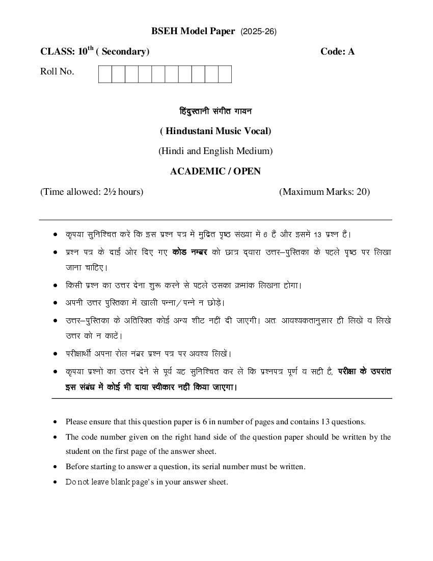 HBSE Class 10 Hindustani Music Vocal Model Paper 2026 PDF