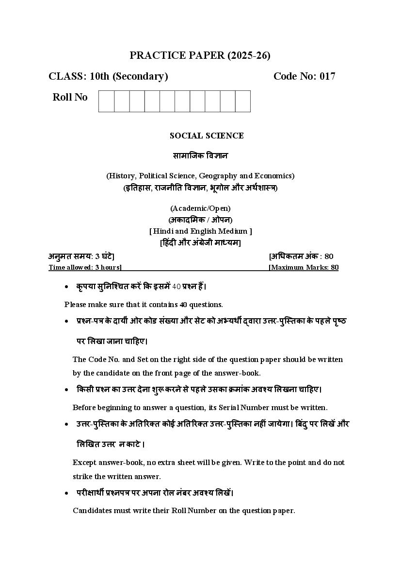 HBSE Class 10 Social Science Model Paper 2026 is now available for download from Haryana Board of School Education. Use the HBSE Sample Paper for Class 10 to prepare for the Social Science exam. Achieving a high percentage in Social Science is crucial for a strong overall score in board exams. If you are in the senior secondary of the Haryana Board, ensure to download the HBSE 10th Sample Paper PDF of Social Science to aid in your board exam preparations.