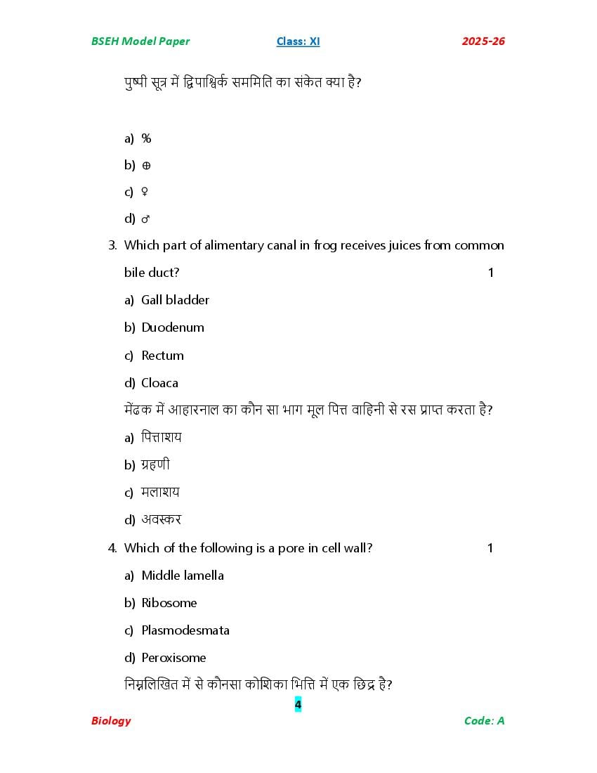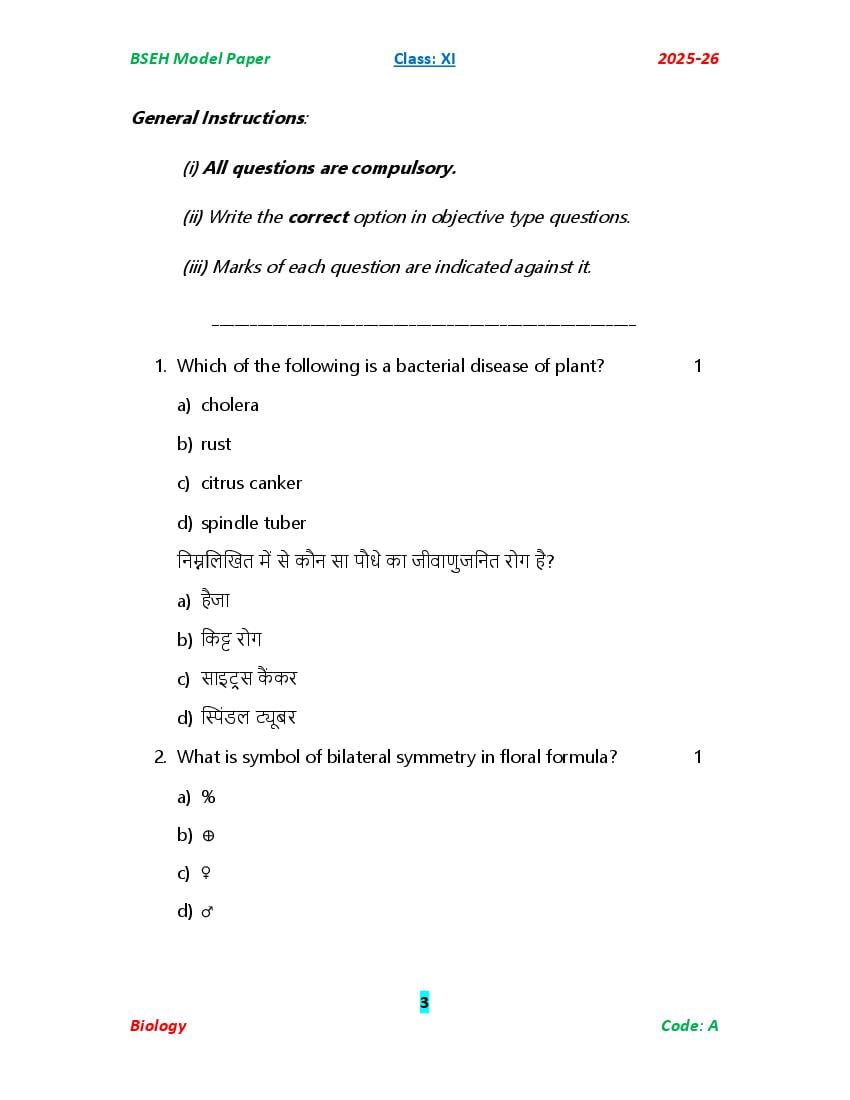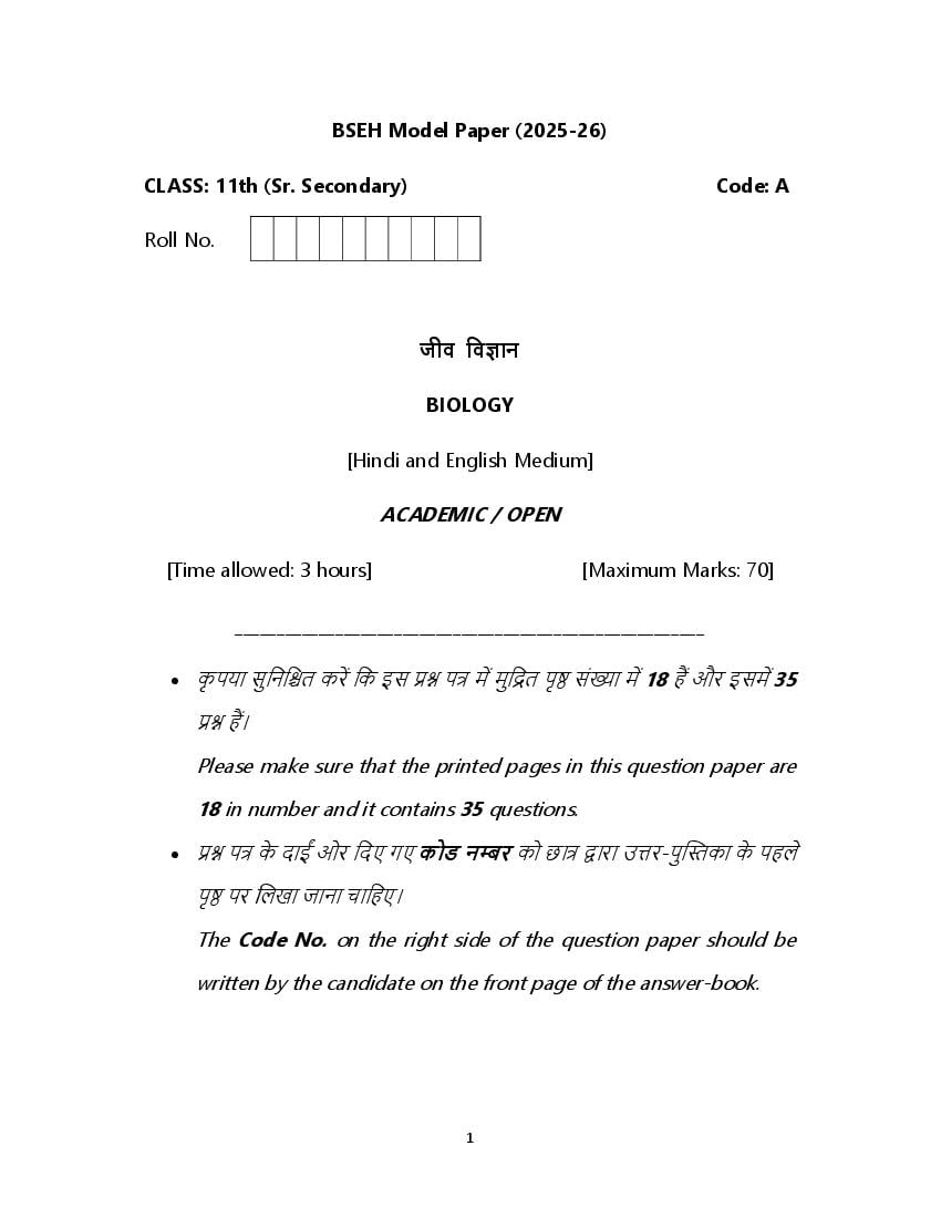 HBSE Class 11 Biology Model Paper 2026 PDF