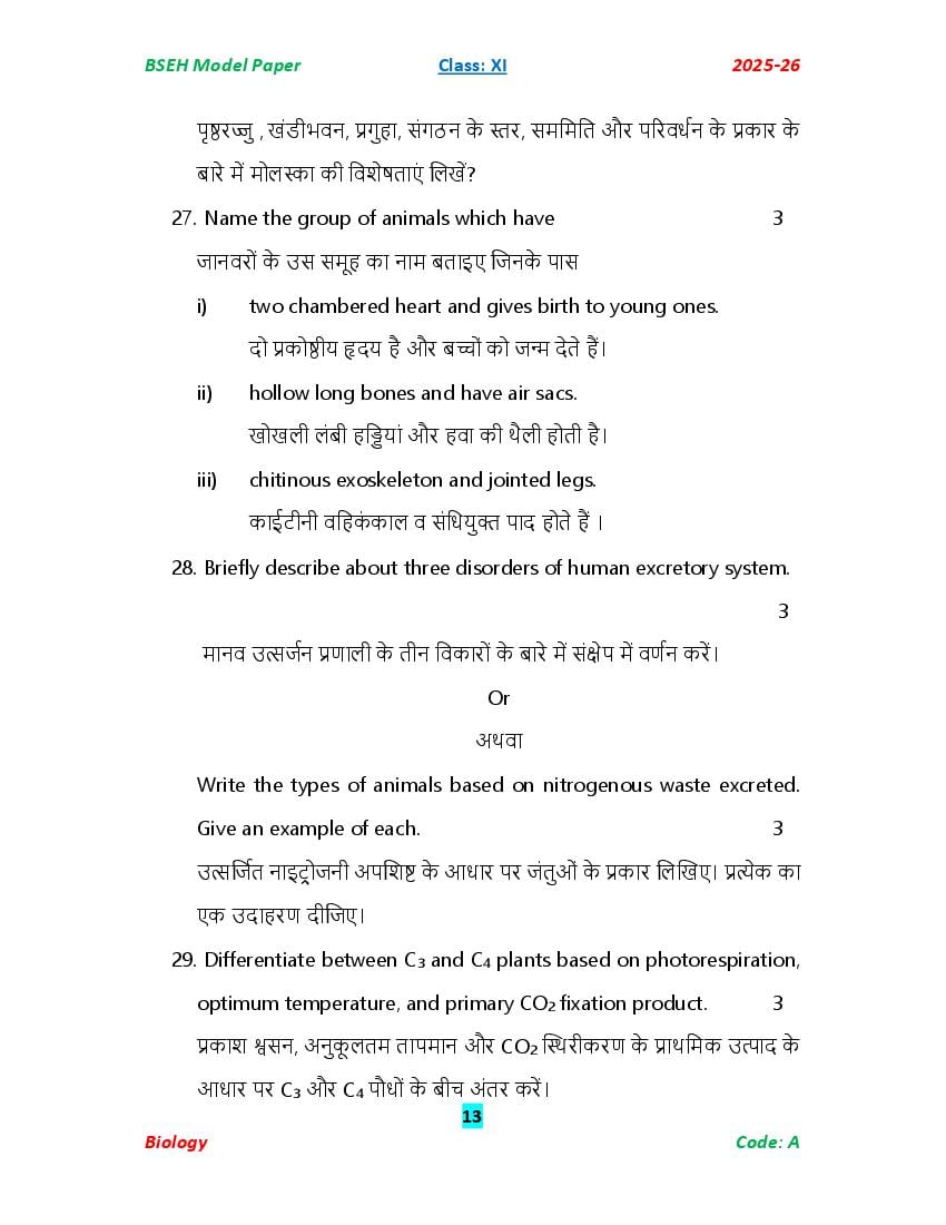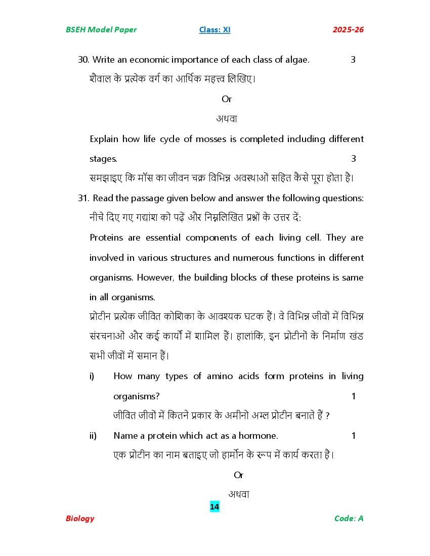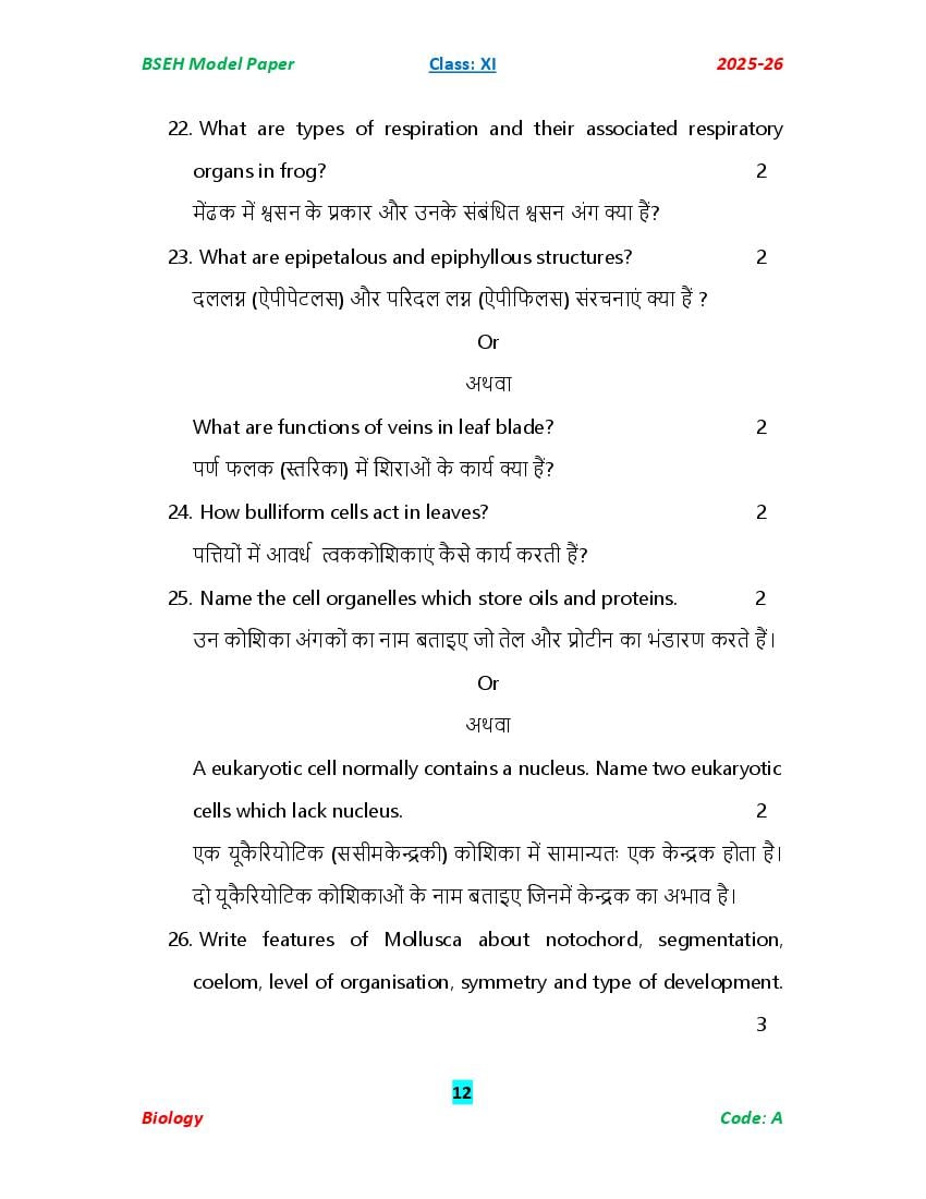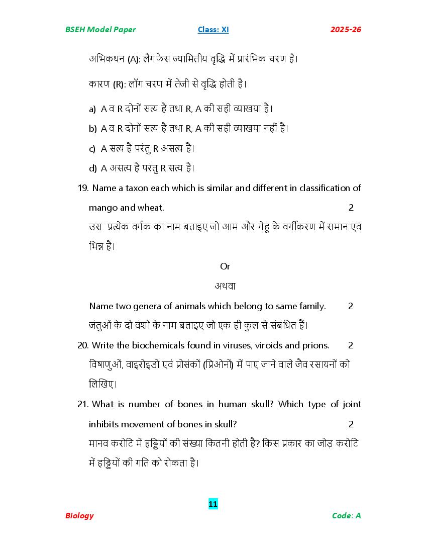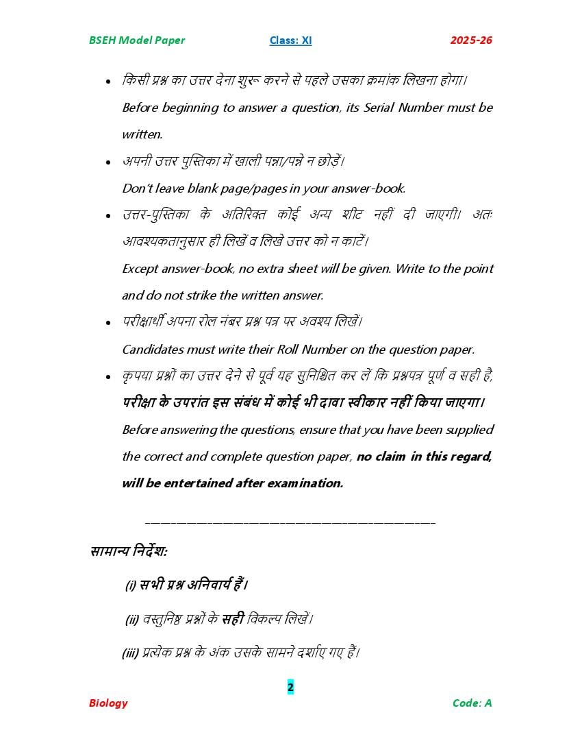 HBSE Class 11 Sample Paper 2026 Biology View Download