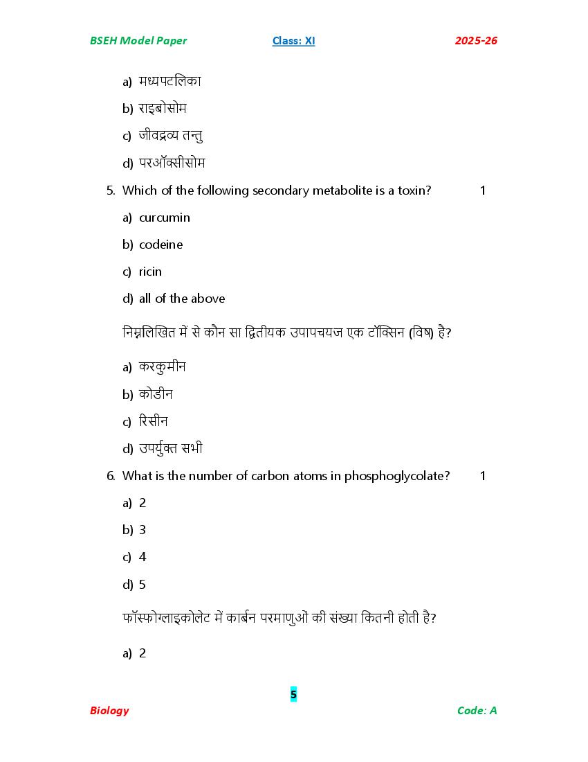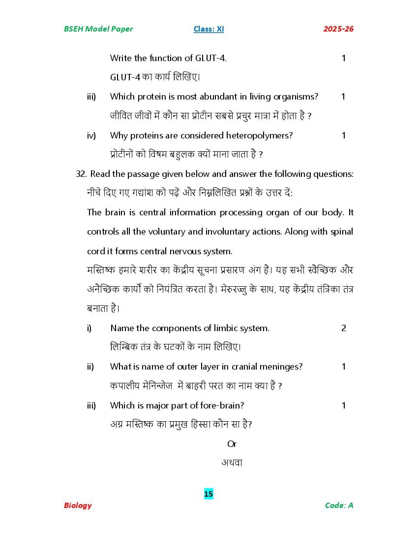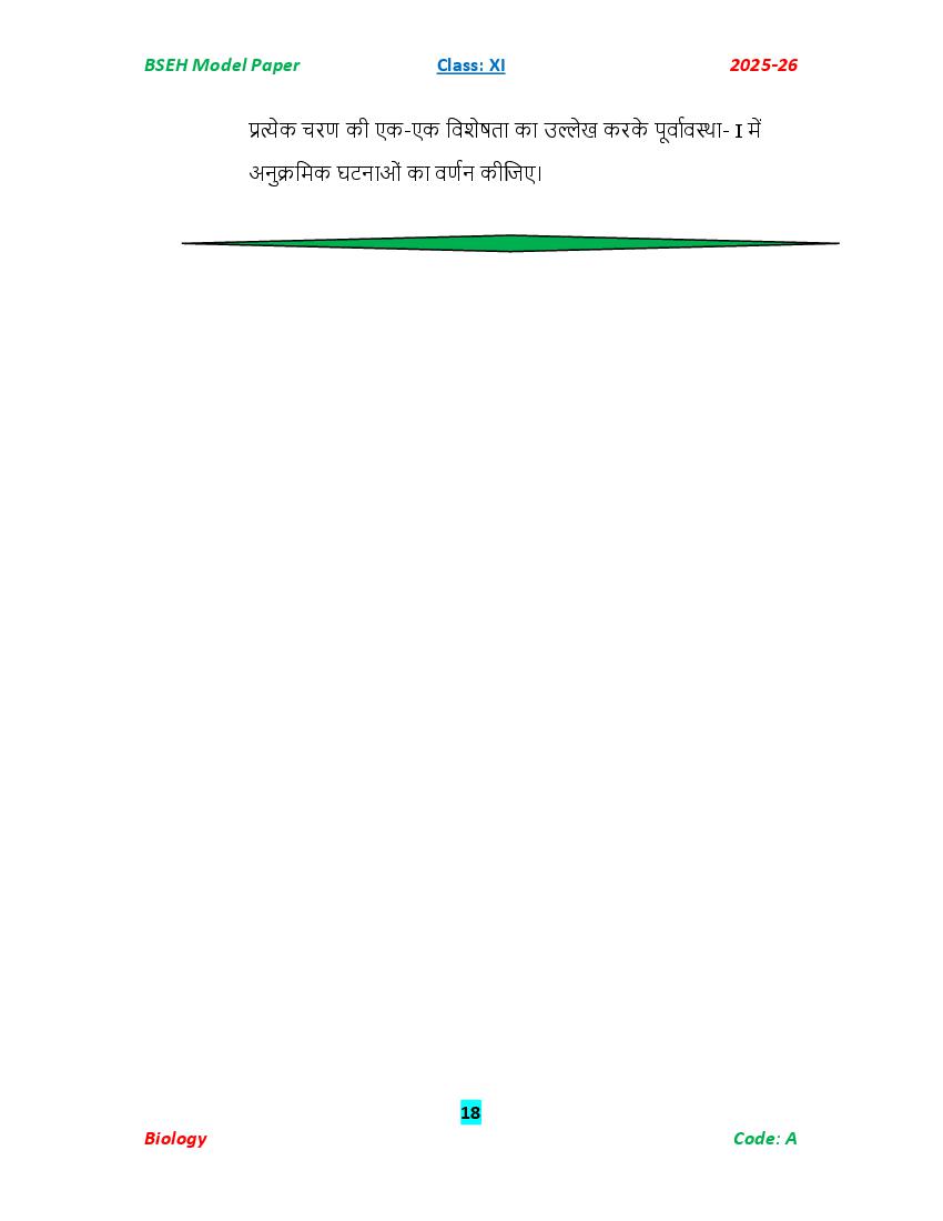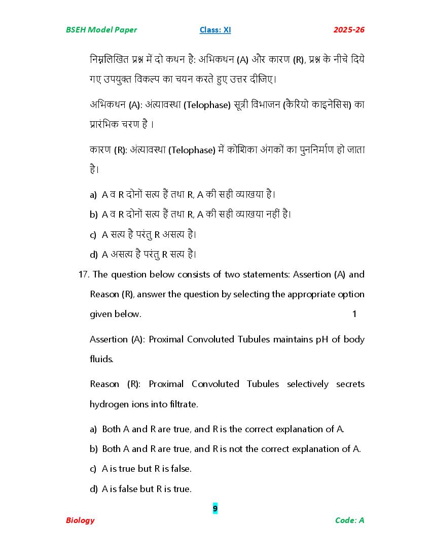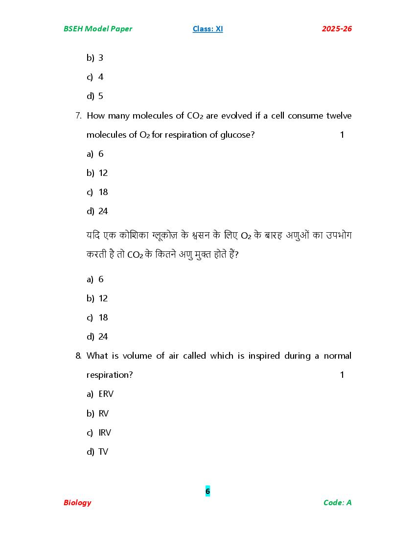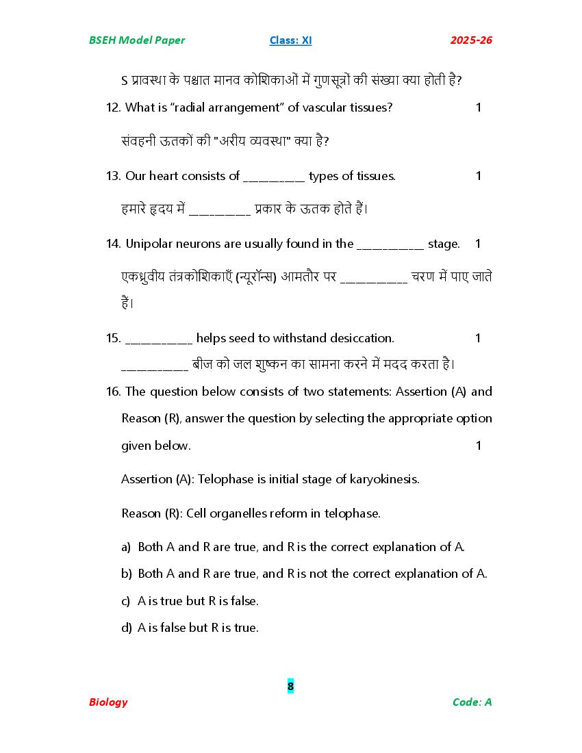 HBSE Class 11 Sample Paper 2026 Biology View Download