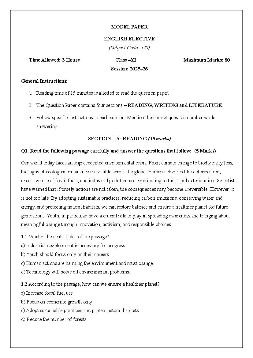 HBSE Class 11 English Elective Model Paper 2026