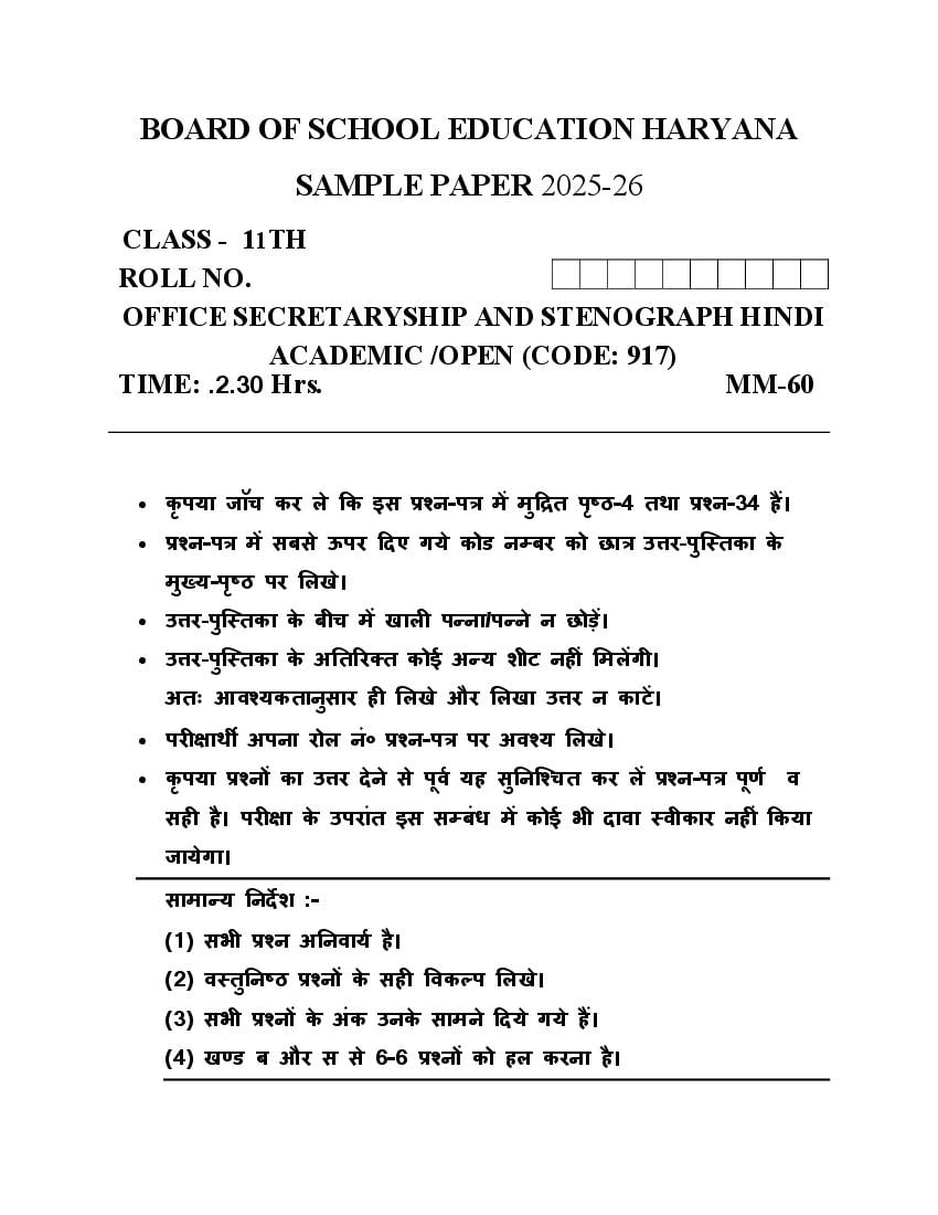 HBSE Class 11 OSS Hindi Model Paper 2026 is now available for download from Haryana Board of School Education. Use the HBSE Sample Paper for Class 11 to prepare for the OSS Hindi exam. Achieving a high percentage in OSS Hindi is crucial for a strong overall score in board exams. If you are in the senior secondary of the Haryana Board, ensure to download the HBSE 11th Sample Paper PDF of OSS Hindi to aid in your board exam preparations.