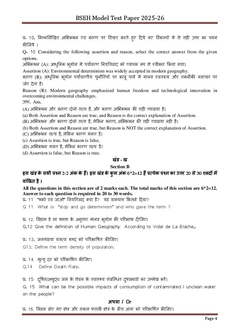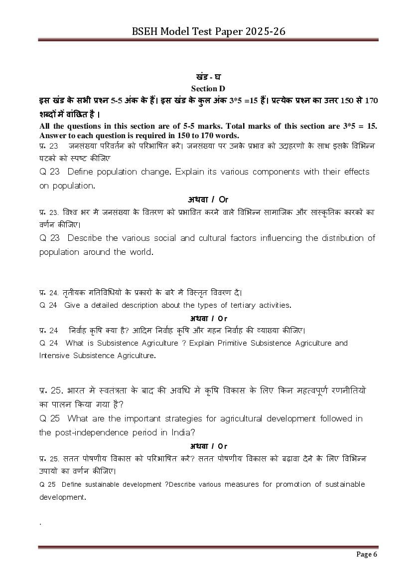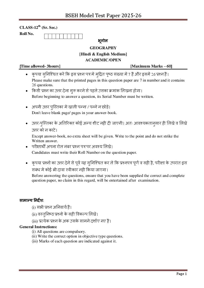 HBSE Class 12 Geography Model Paper 2026