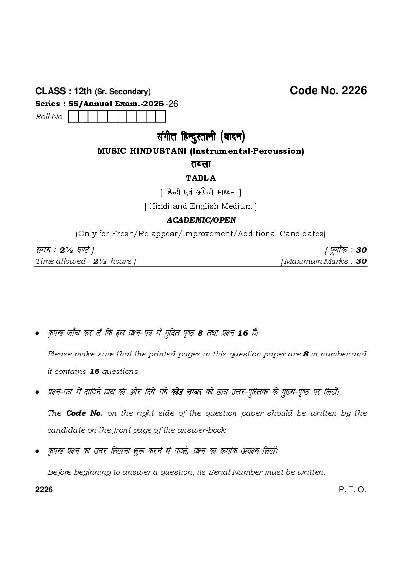 HBSE Class 12 Hindustani Music Tabla Model Paper 2026