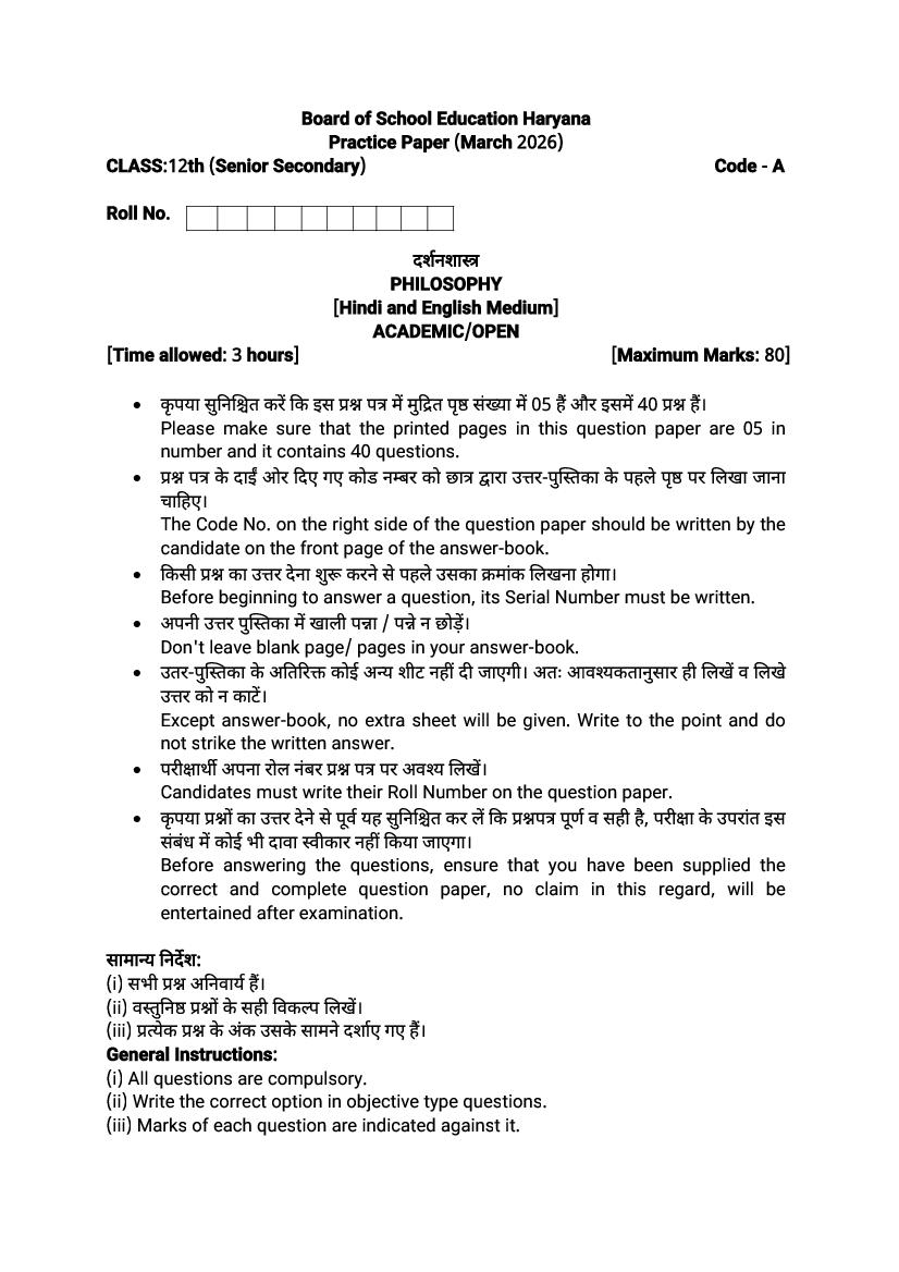HBSE Class 12 Philosophy Model Paper 2026 is now available for download from Haryana Board of School Education. Use the HBSE Sample Paper for Class 12 to prepare for the Philosophy exam. Achieving a high percentage in Philosophy is crucial for a strong overall score in board exams. If you are in the senior secondary of the Haryana Board, ensure to download the HBSE 12th Sample Paper PDF of Philosophy to aid in your board exam preparations.