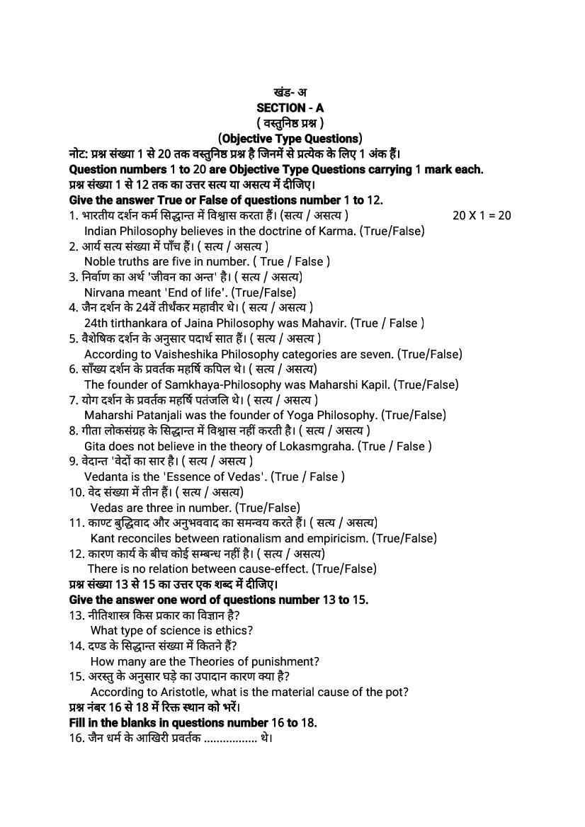 HBSE Class 12 Sample Paper 2026 Philosophy View Download