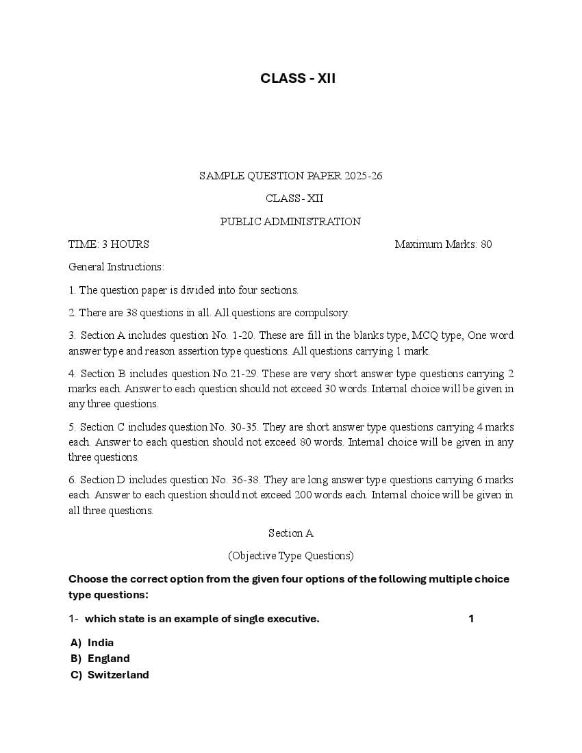 HBSE Class 12 Sample Paper 2026 Public Administration View Download