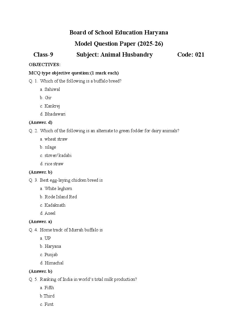 HBSE Class 9 Animal Husbandary Model Paper 2025 – Click Here to Download Model Paper PDF