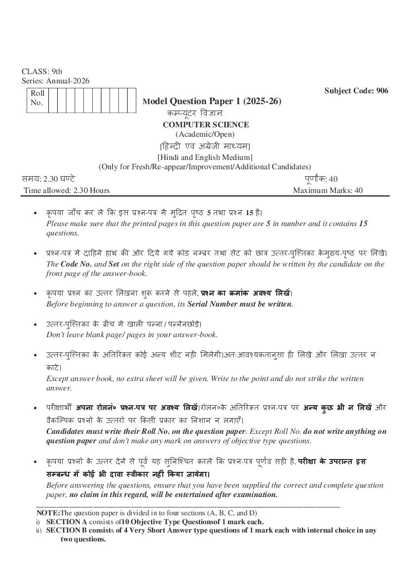HBSE Class 9 Computer Science Model Paper 2026