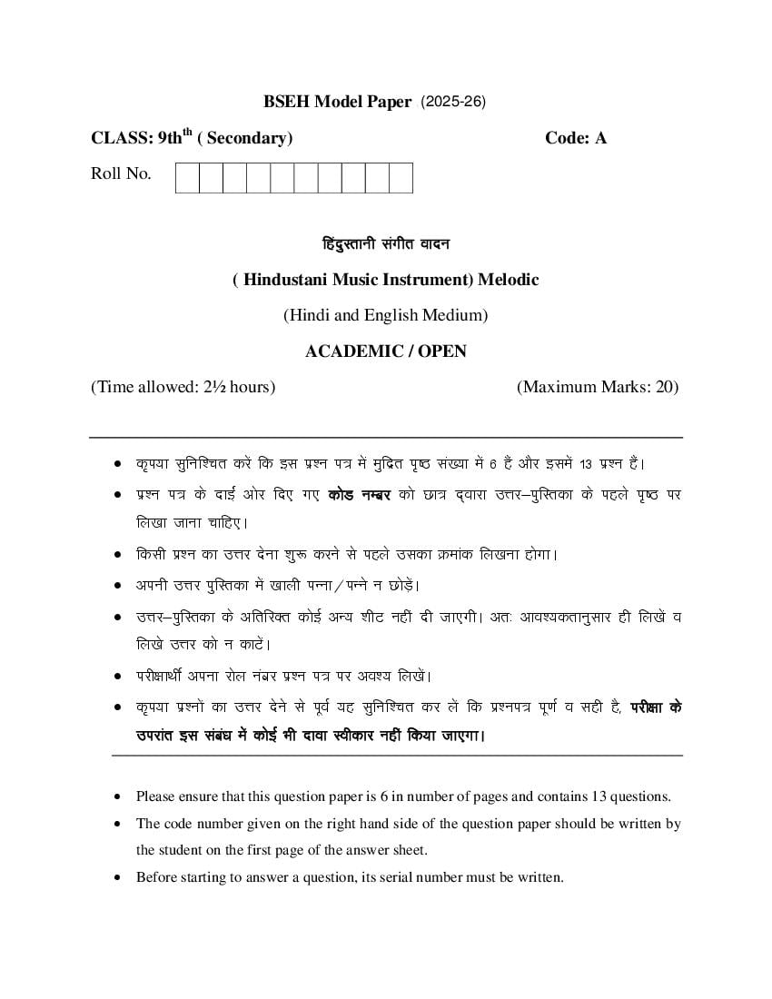 HBSE Class 9 Hindustani Music Instrumental Melodic Model Paper 2026 – Click Here to Download Model Paper PDF