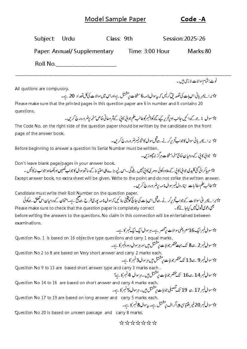 HBSE Class 9 Urdu Model Paper 2026