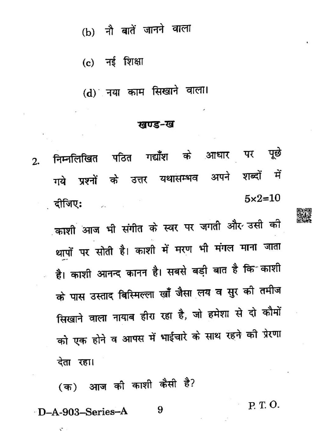 HP Board Class 10th Hindi Question Paper 2025 PDF