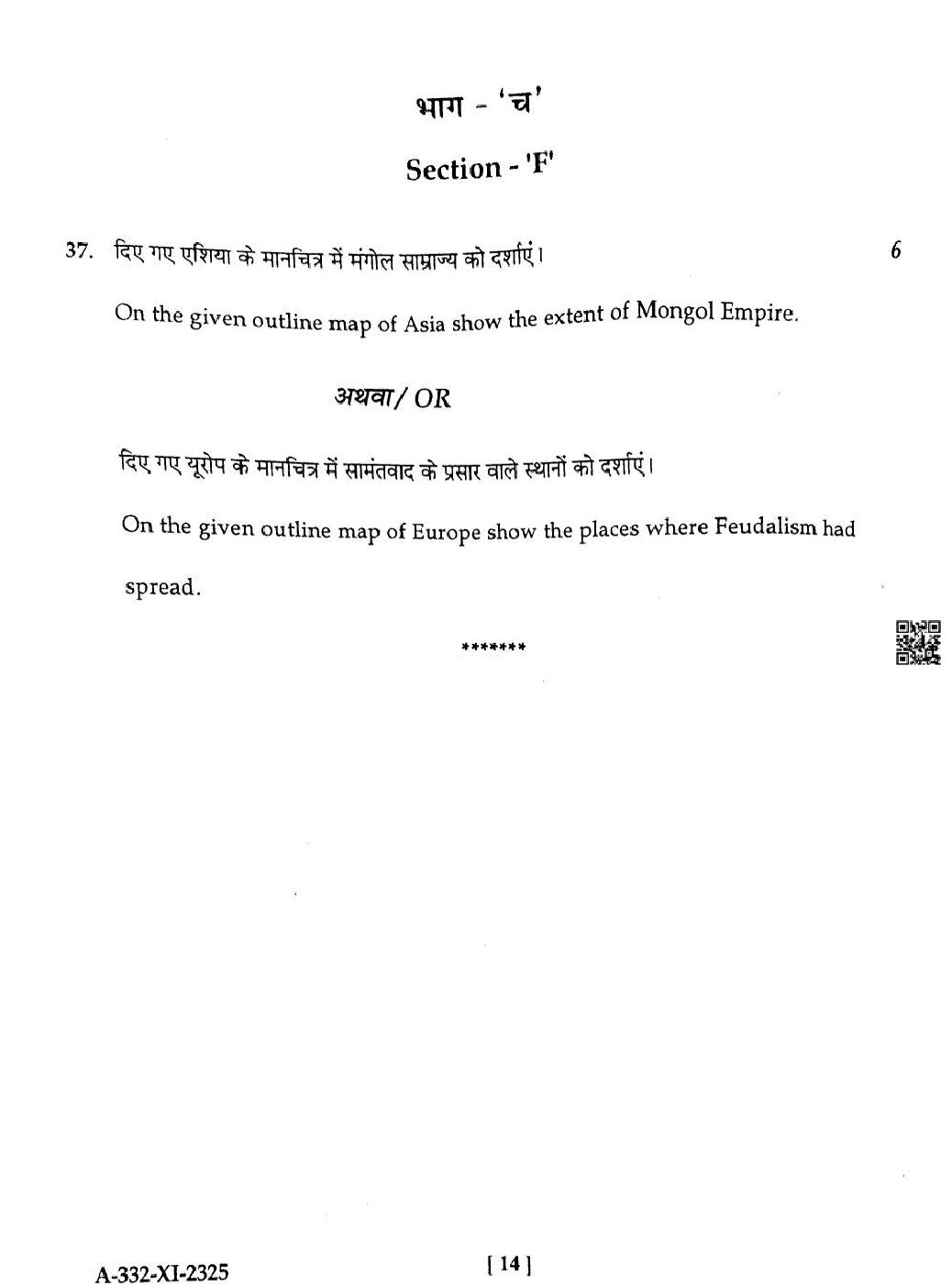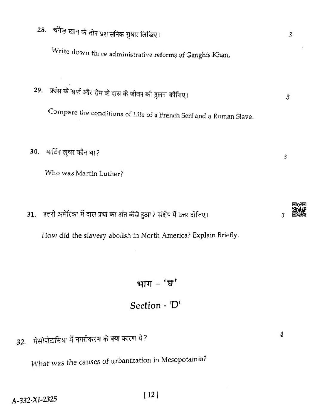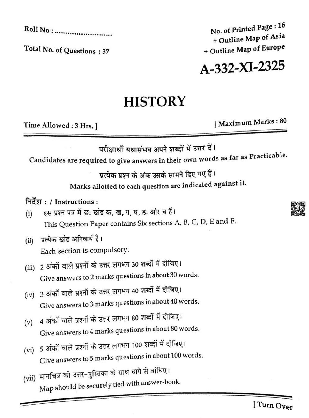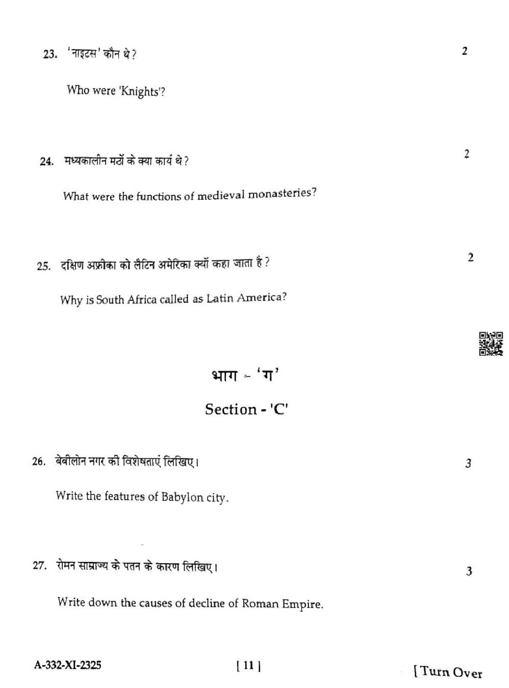 HP Board Class 11th History Question Paper 2025