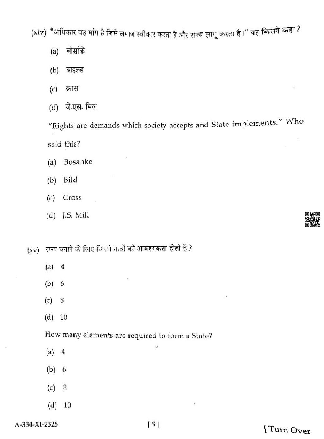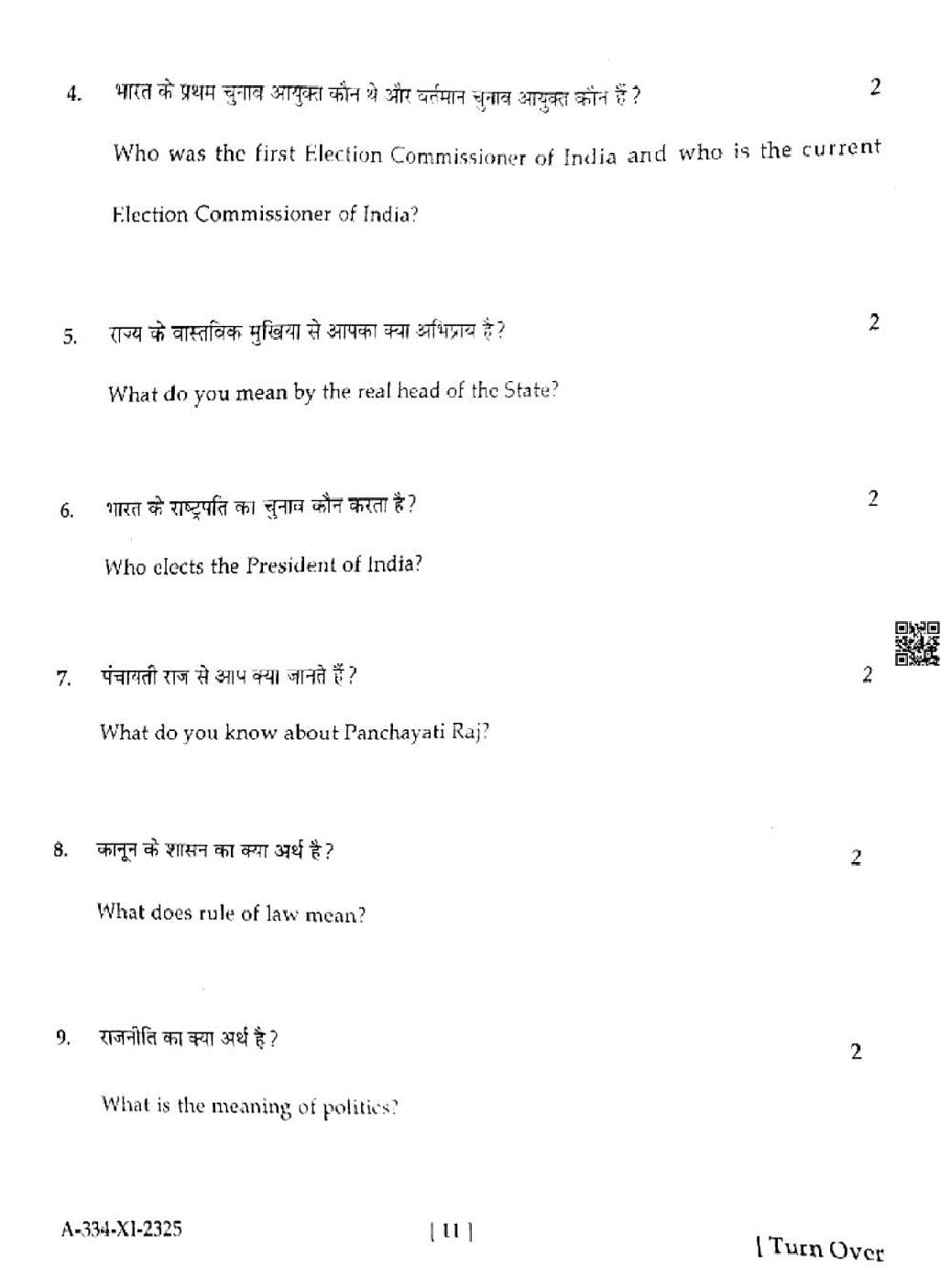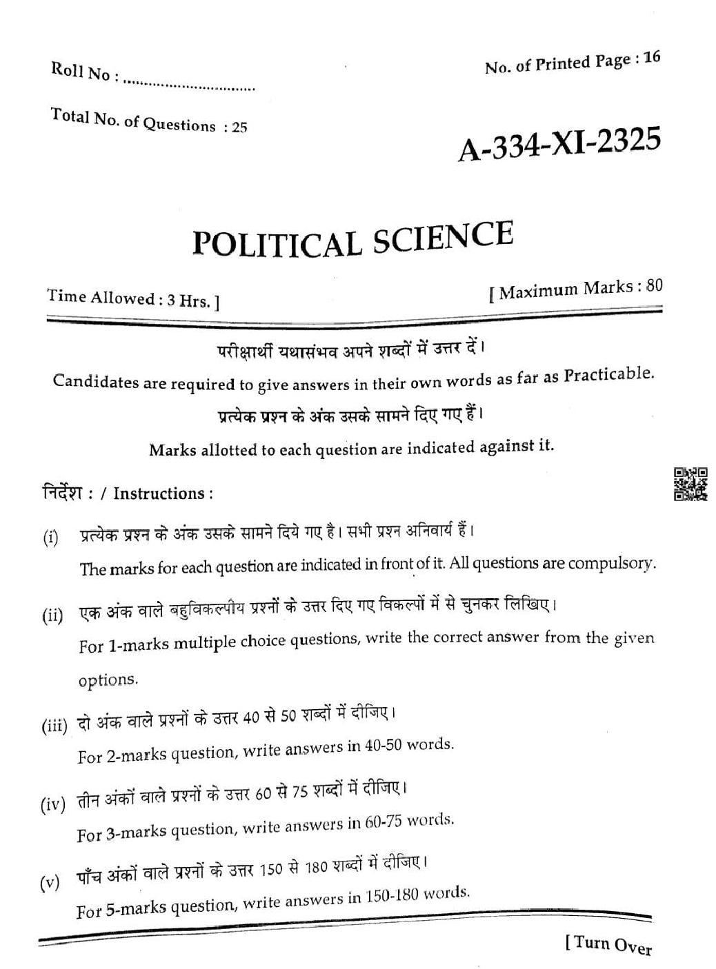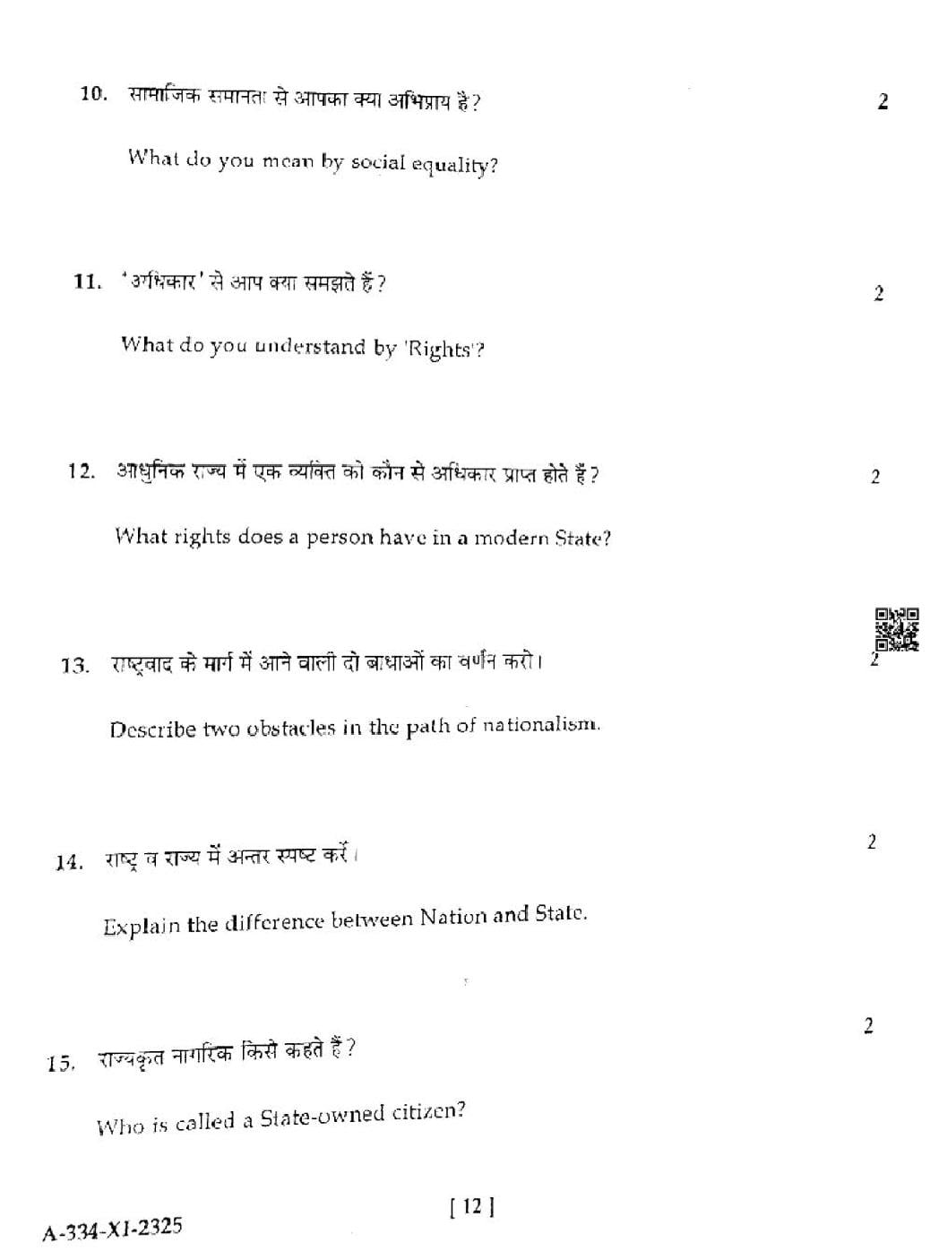 HP Board Class 11th Political Science Question Paper 2025