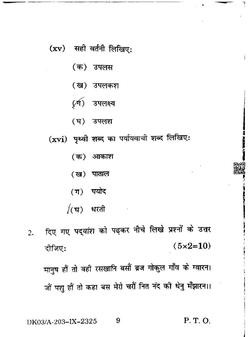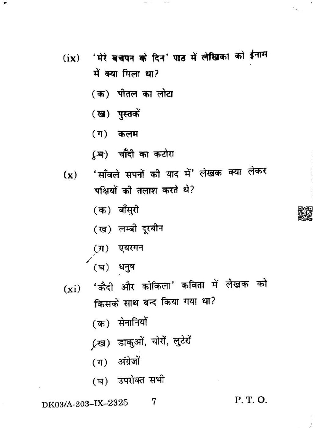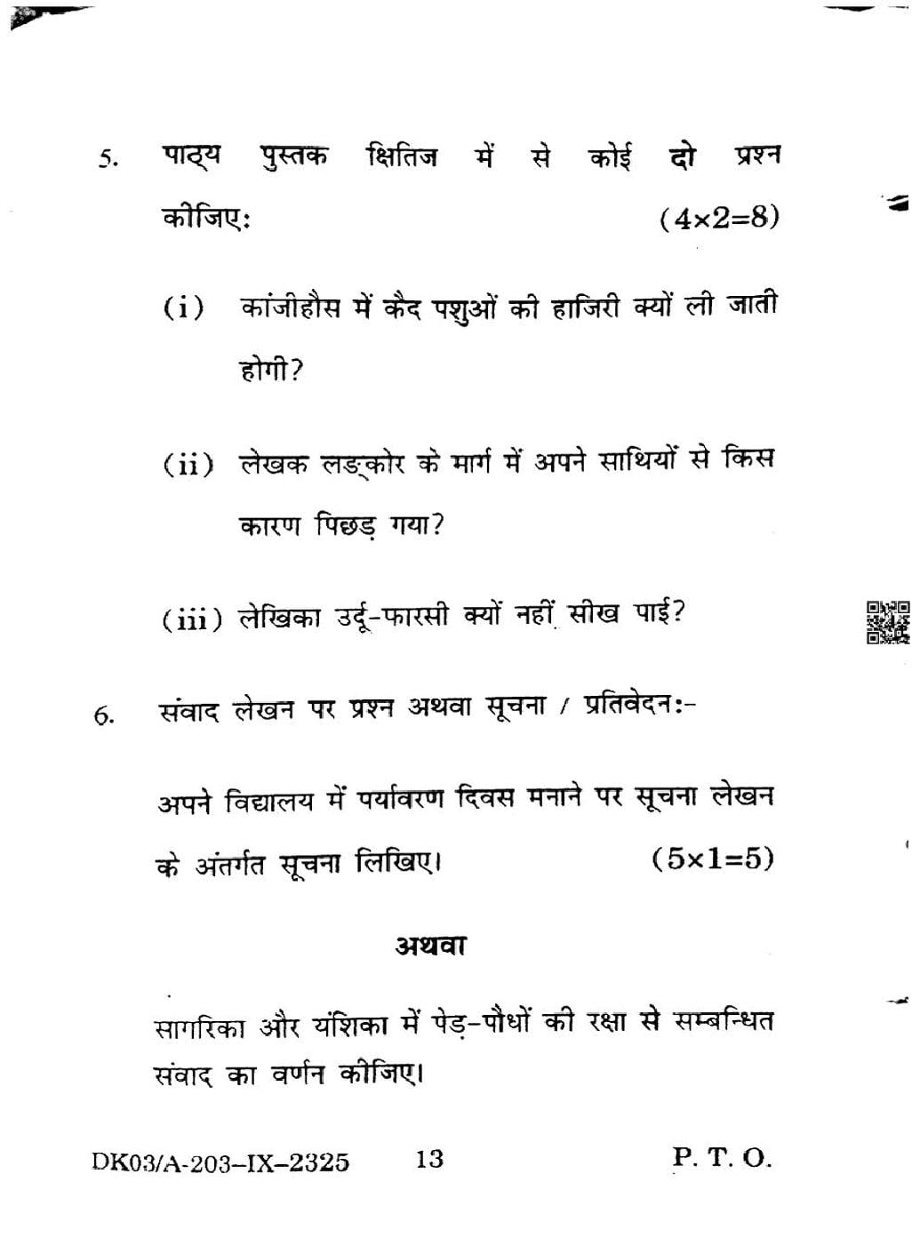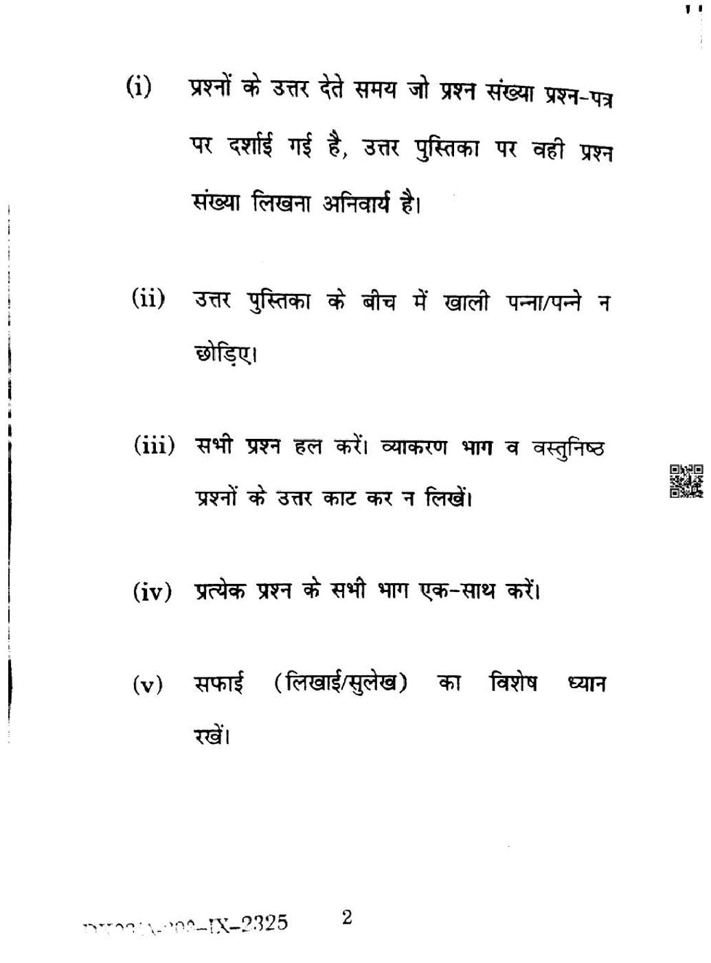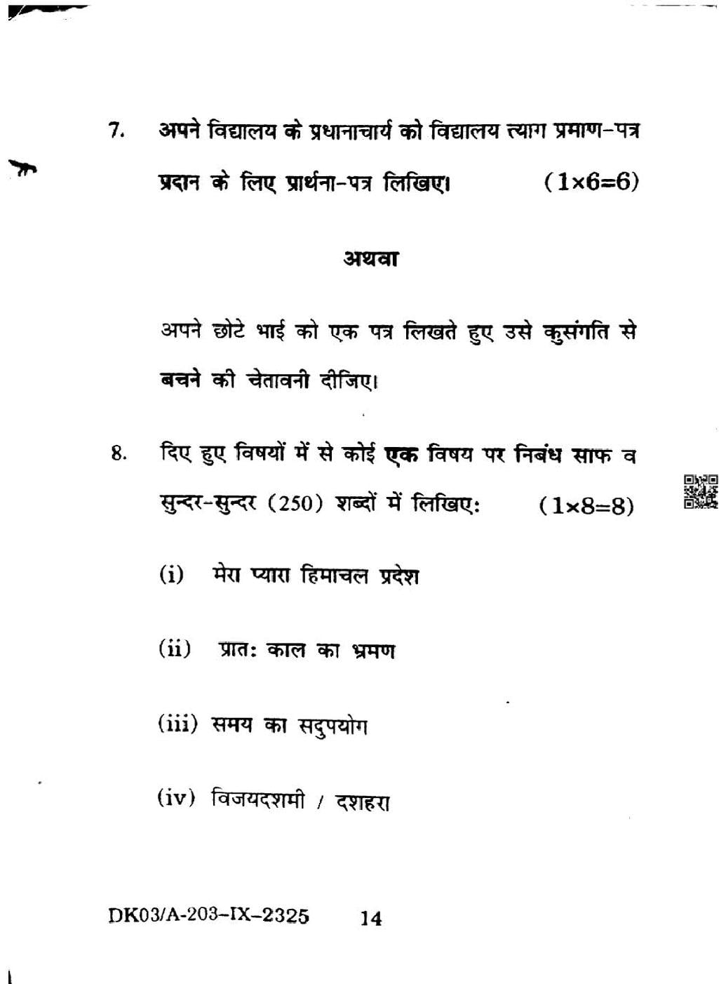 HP Board Class 9 Question Paper 2025 Hindi View Download