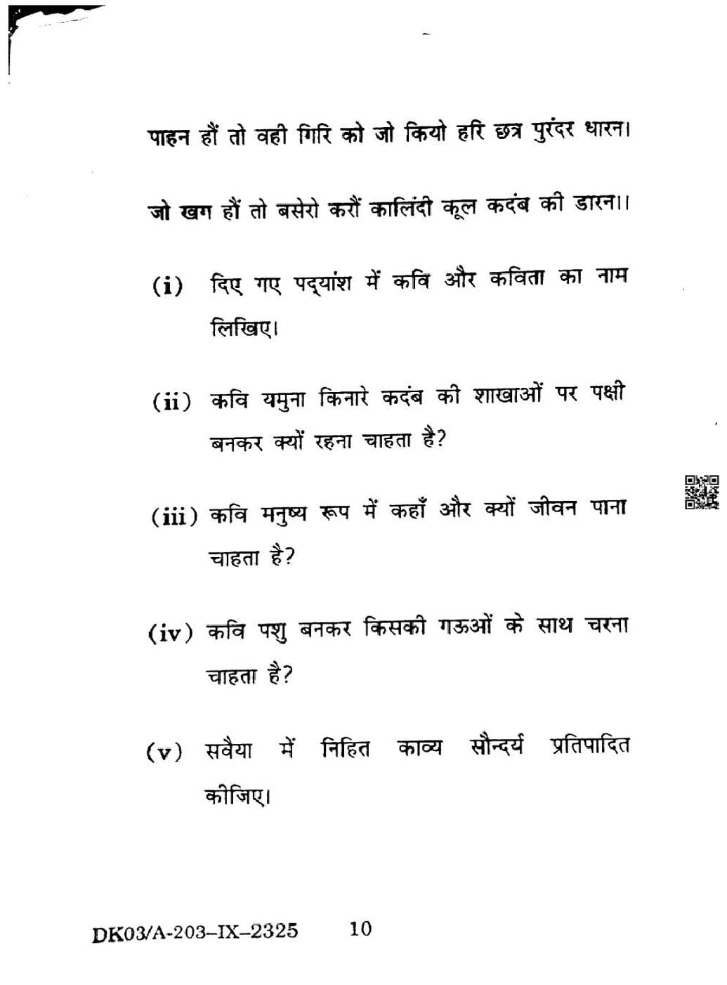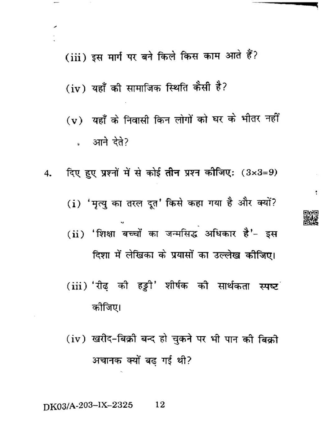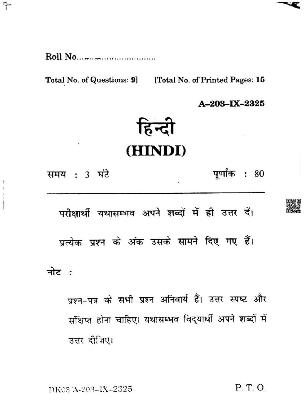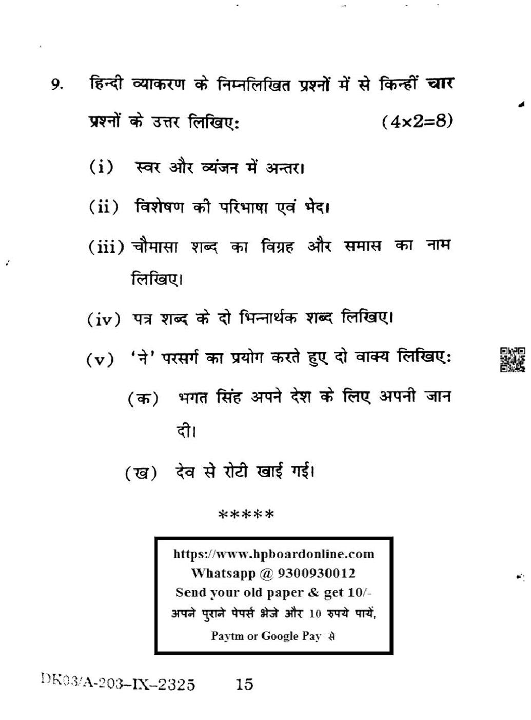HP Board Class 9th Hindi Question Paper 2025
