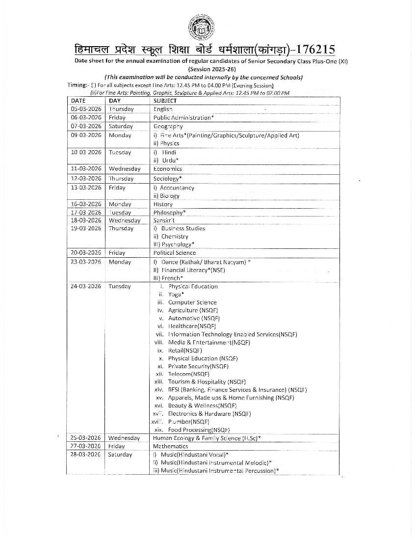 The exam date sheet of Himachal Pradesh Board for Class 11 exams are as follows.