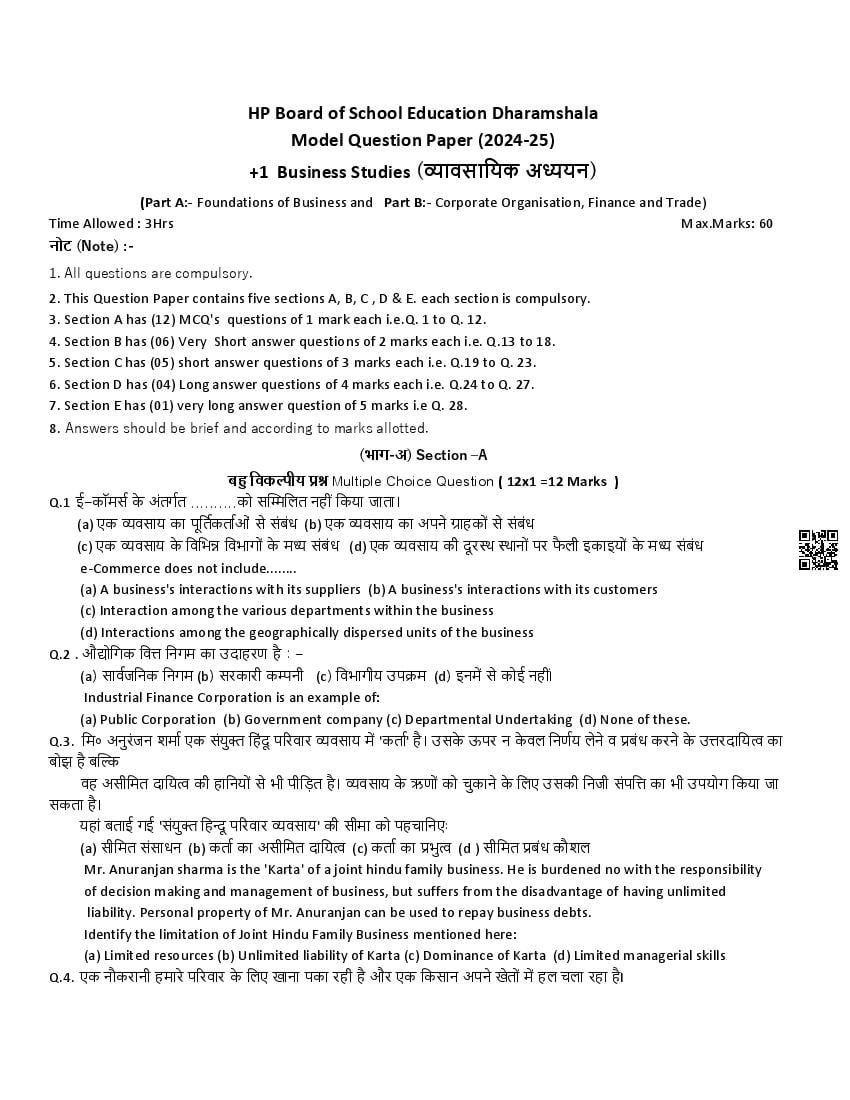 HP Board 11th Class Model Question Paper 2025 Business Studies View Download