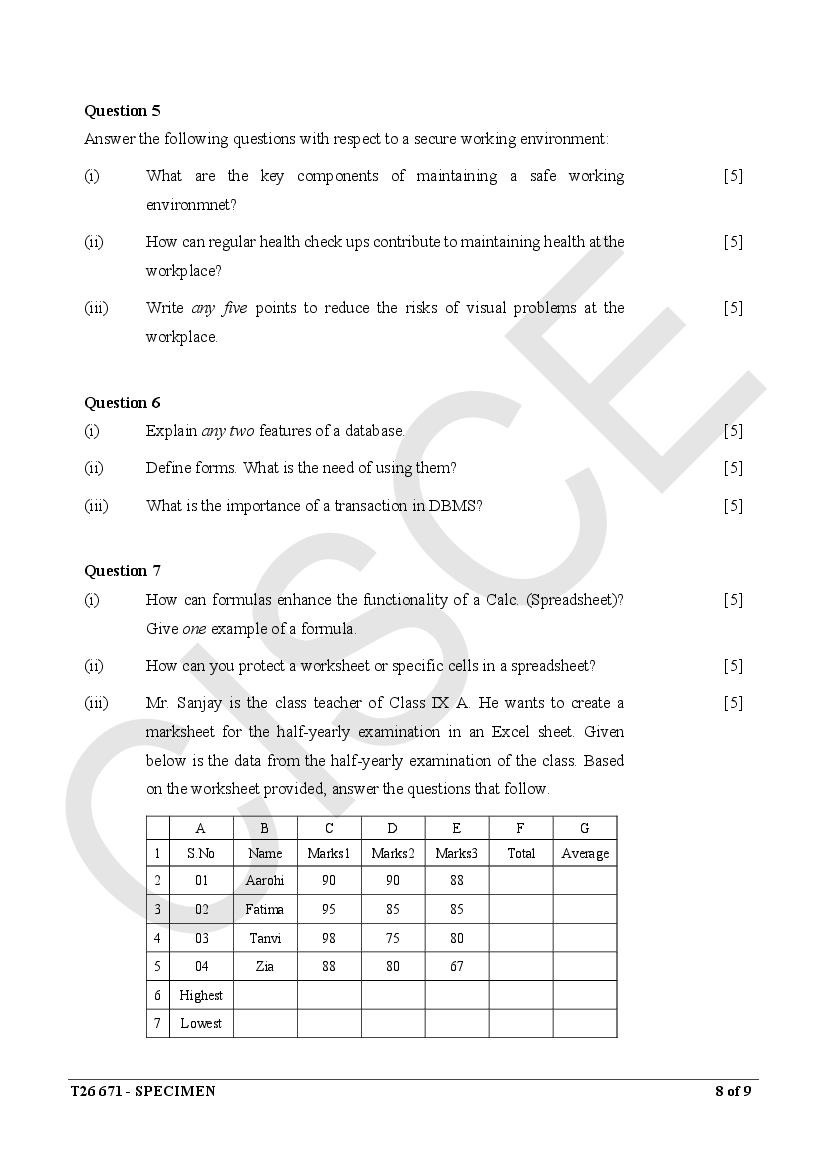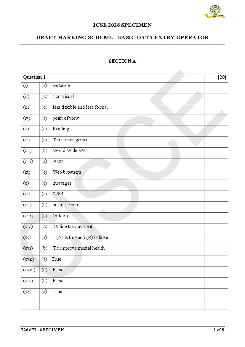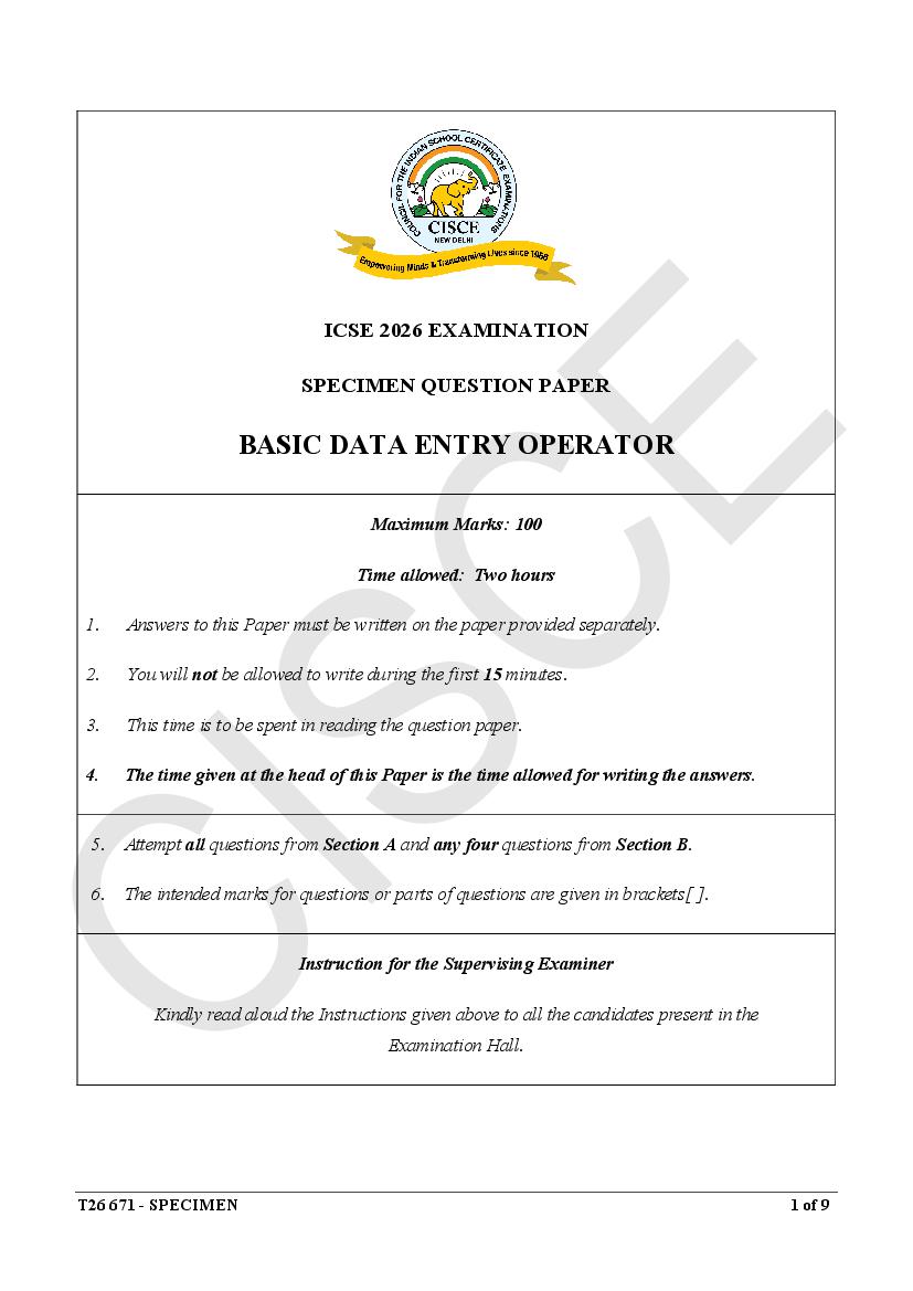 The specimen paper for ICSE 2026, for Basic Data Entry Operator is now available. The direct link to download PDF of this ICSE specimen paper 2026 is as follows.