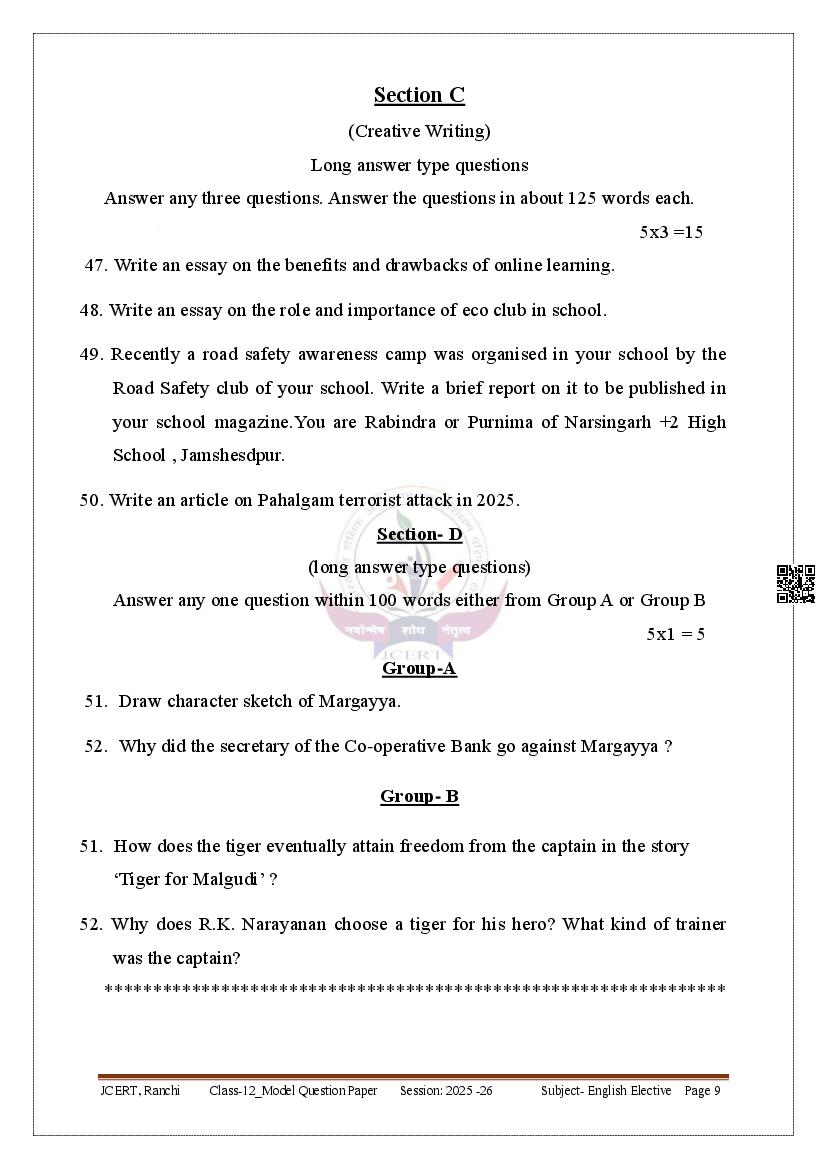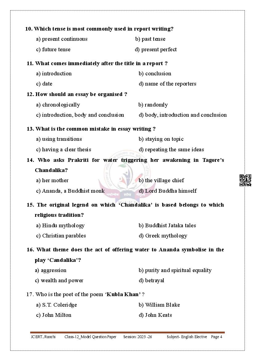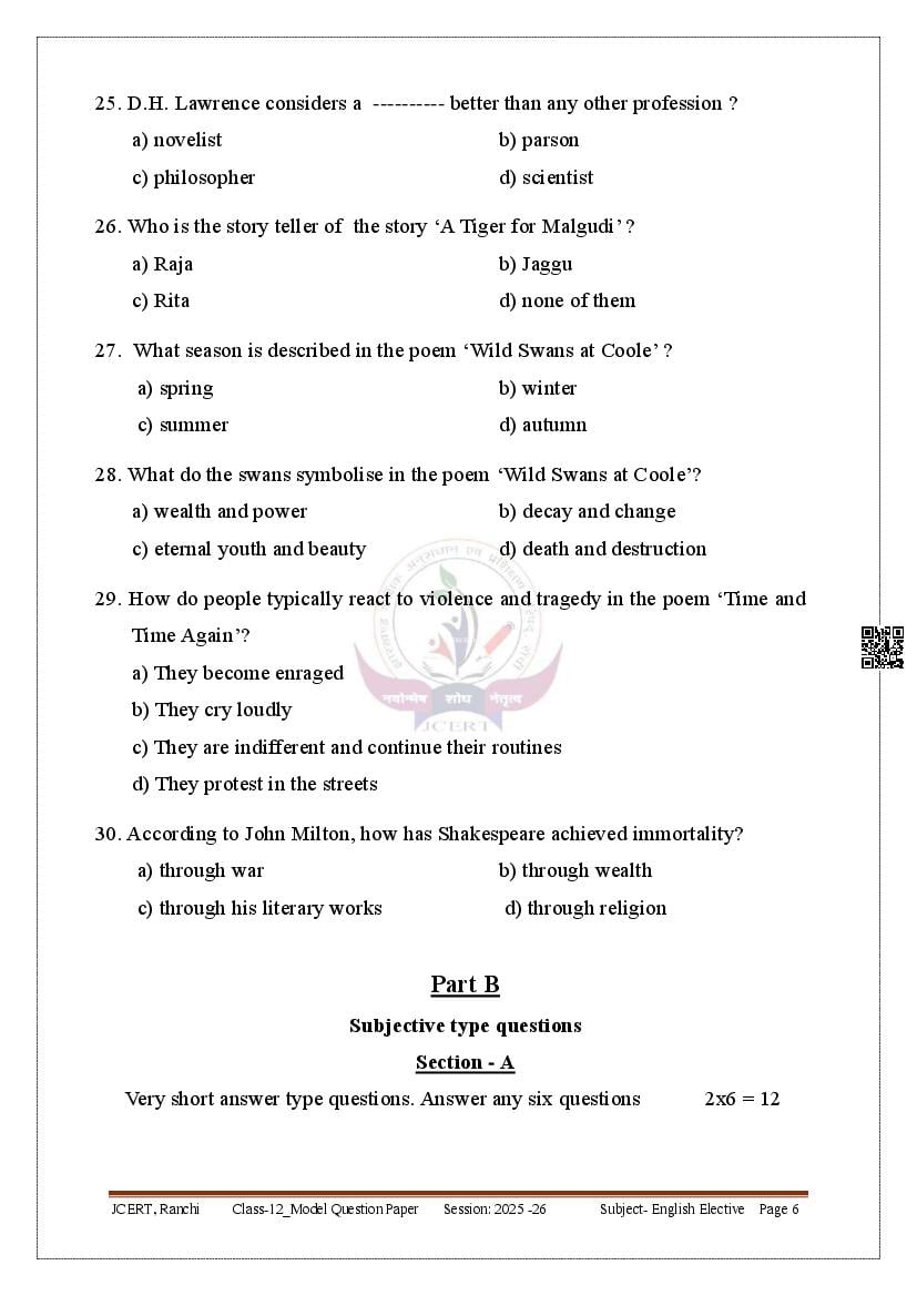 JAC Class 12 Model Question Paper 2026 English Elective View Download