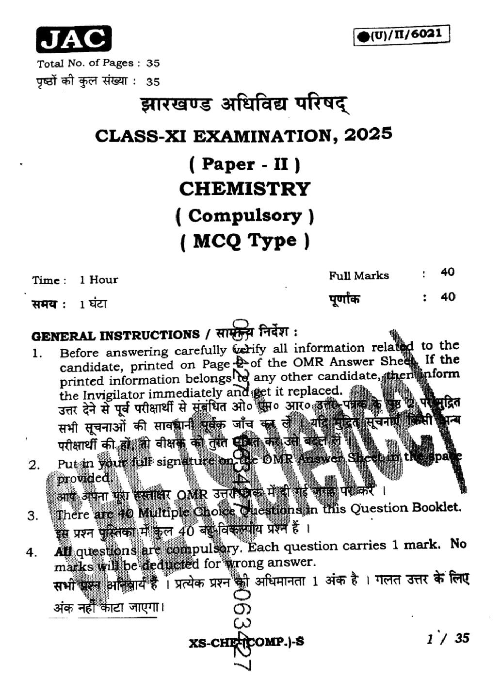 JAC Board Class 11 Question Paper 2025 Chemsitry View Download