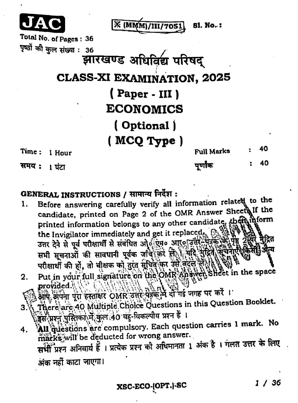 JAC Board Class 11 Question Paper 2025 Economics View Download