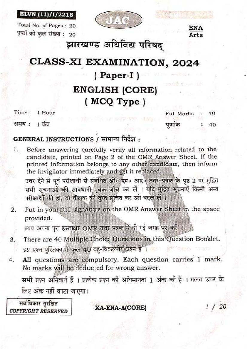JAC Board Class 11 Question Paper 2024 English Arts View Download