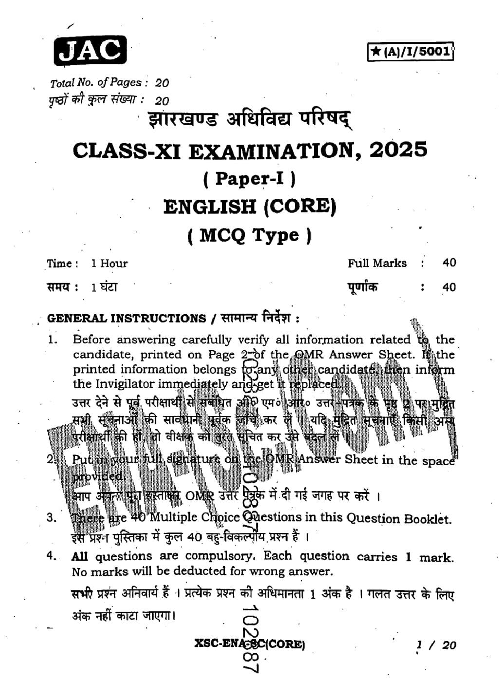 JAC Board Class 11 English (Arts) Question Paper 2025 PDF Download Link – Click Here to Download Question Paper PDF