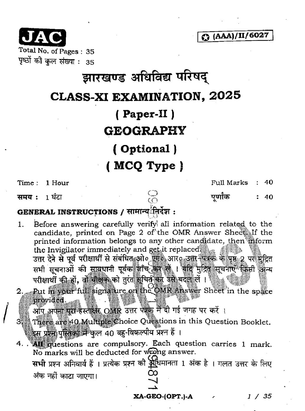 JAC Board Class 11 Question Paper 2025 Geography View Download
