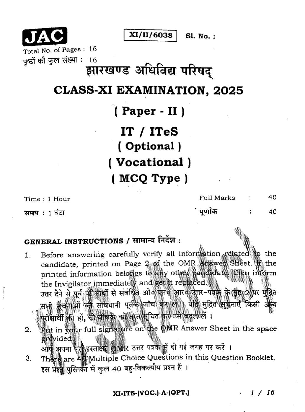 JAC Board Class 11 Question Paper 2025 IT ITES View Download
