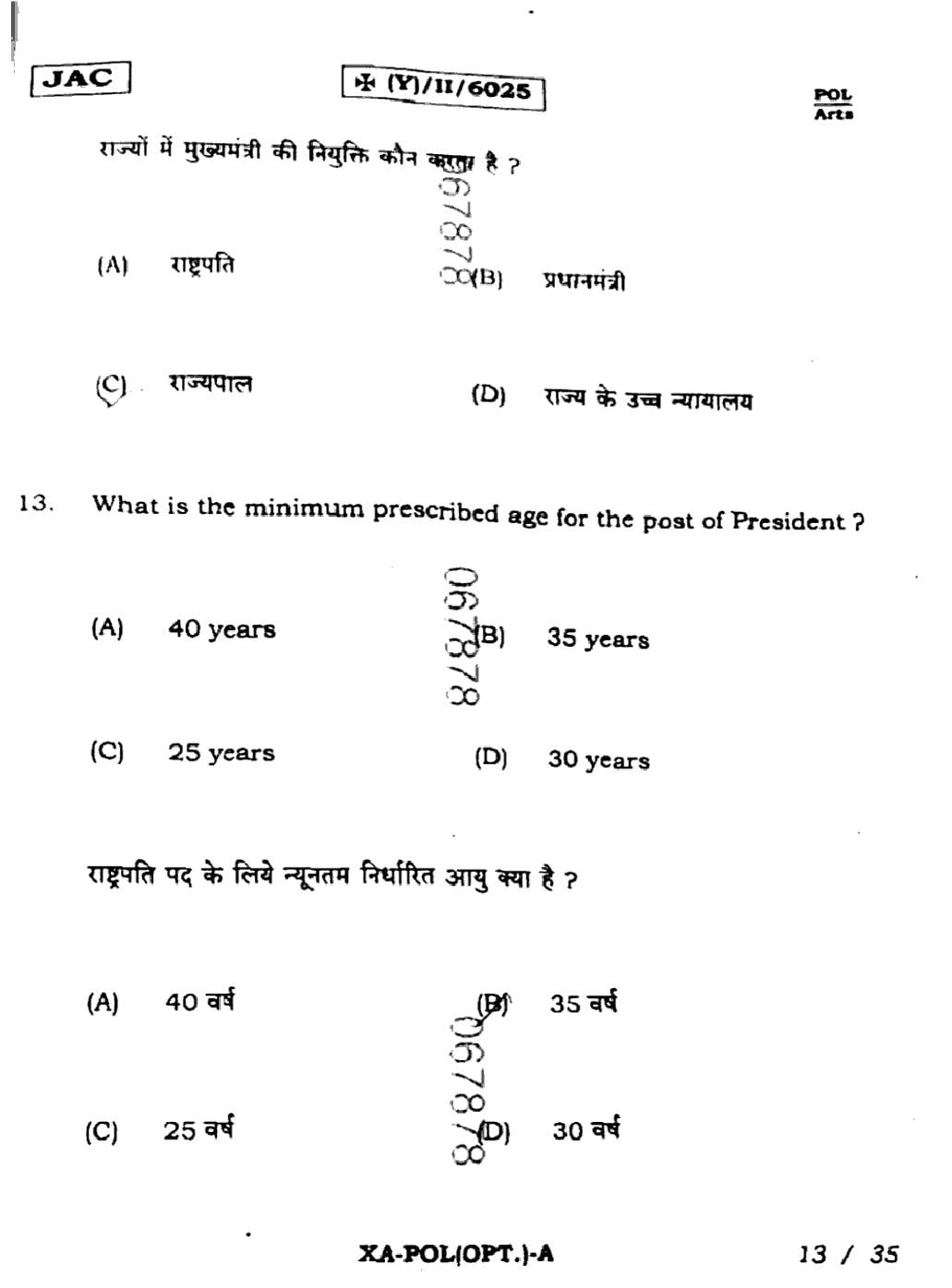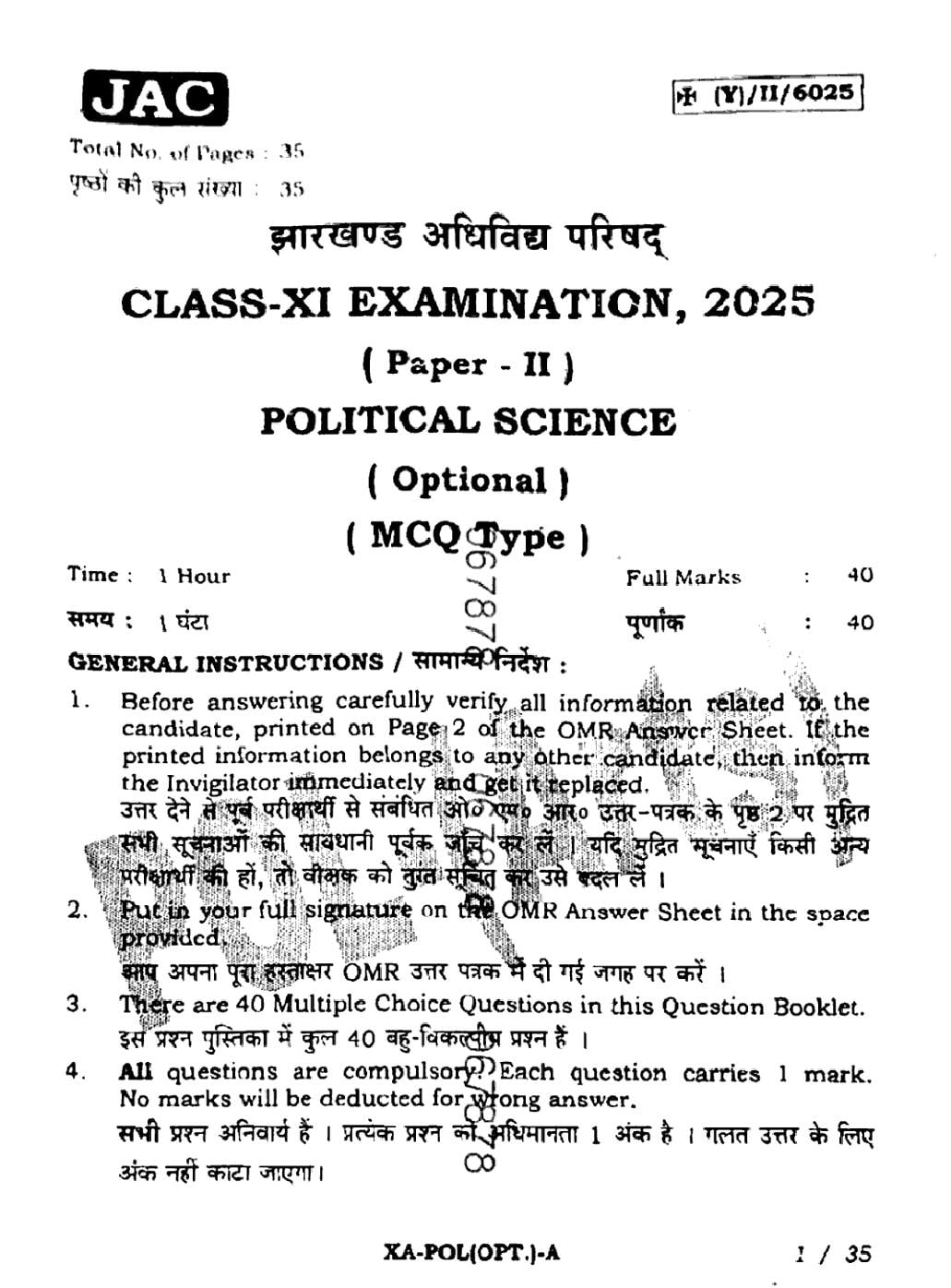 JAC Board Class 11 Question Paper 2025 Political Science View Download