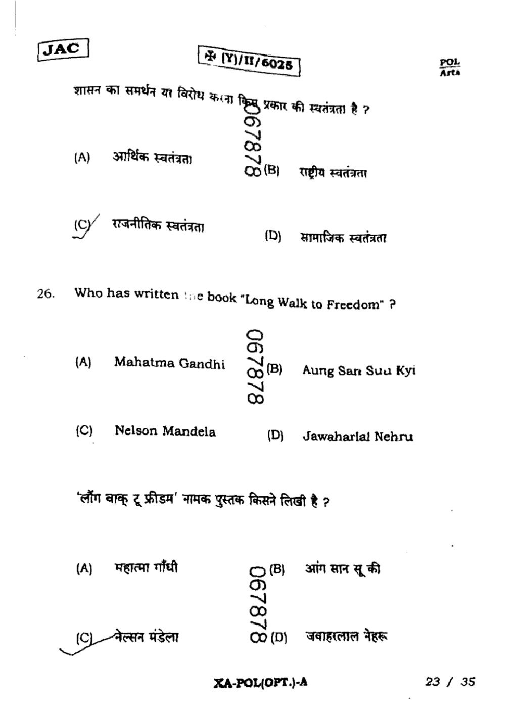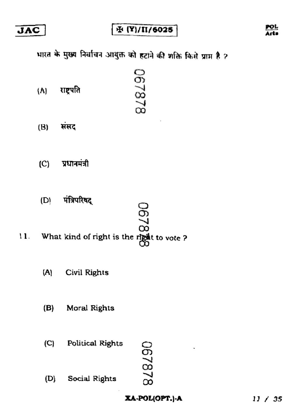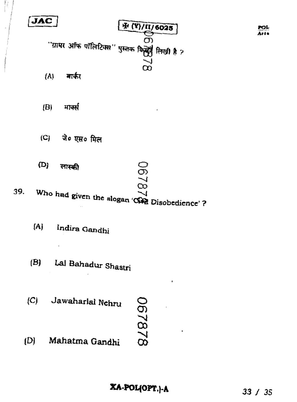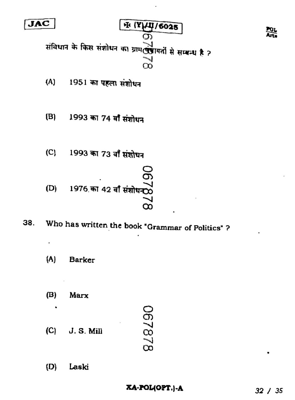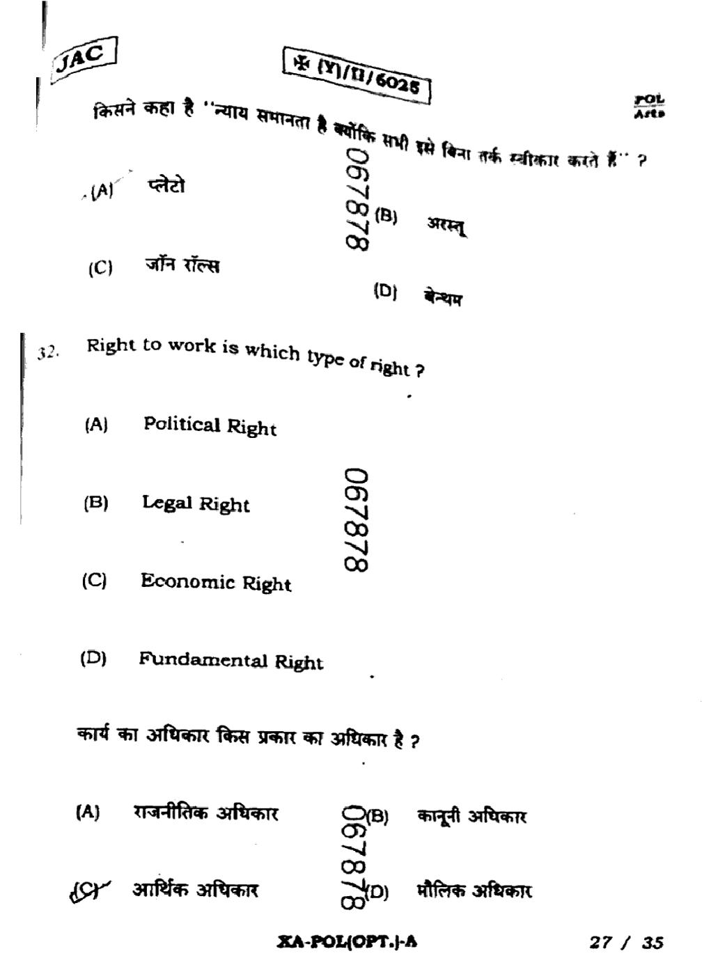 JAC Board Class 11 Political Science Previous Year Question Paper