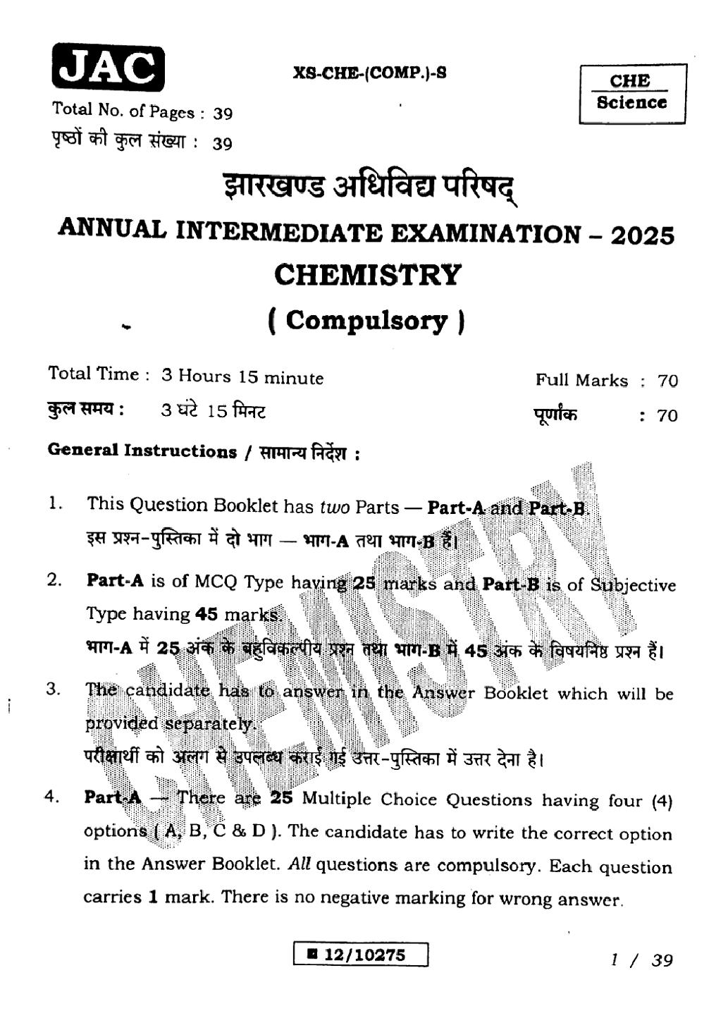 JAC Board Class 12 Chemistry Question Paper 2025 PDF Download Link – Click Here to Download Question Paper PDF