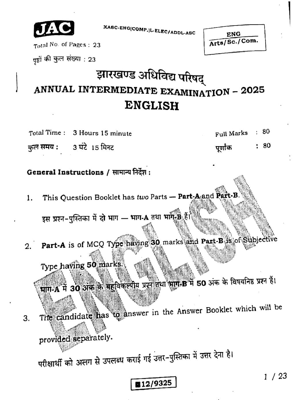 JAC Board Class 12 Question Paper 2025 English View Download