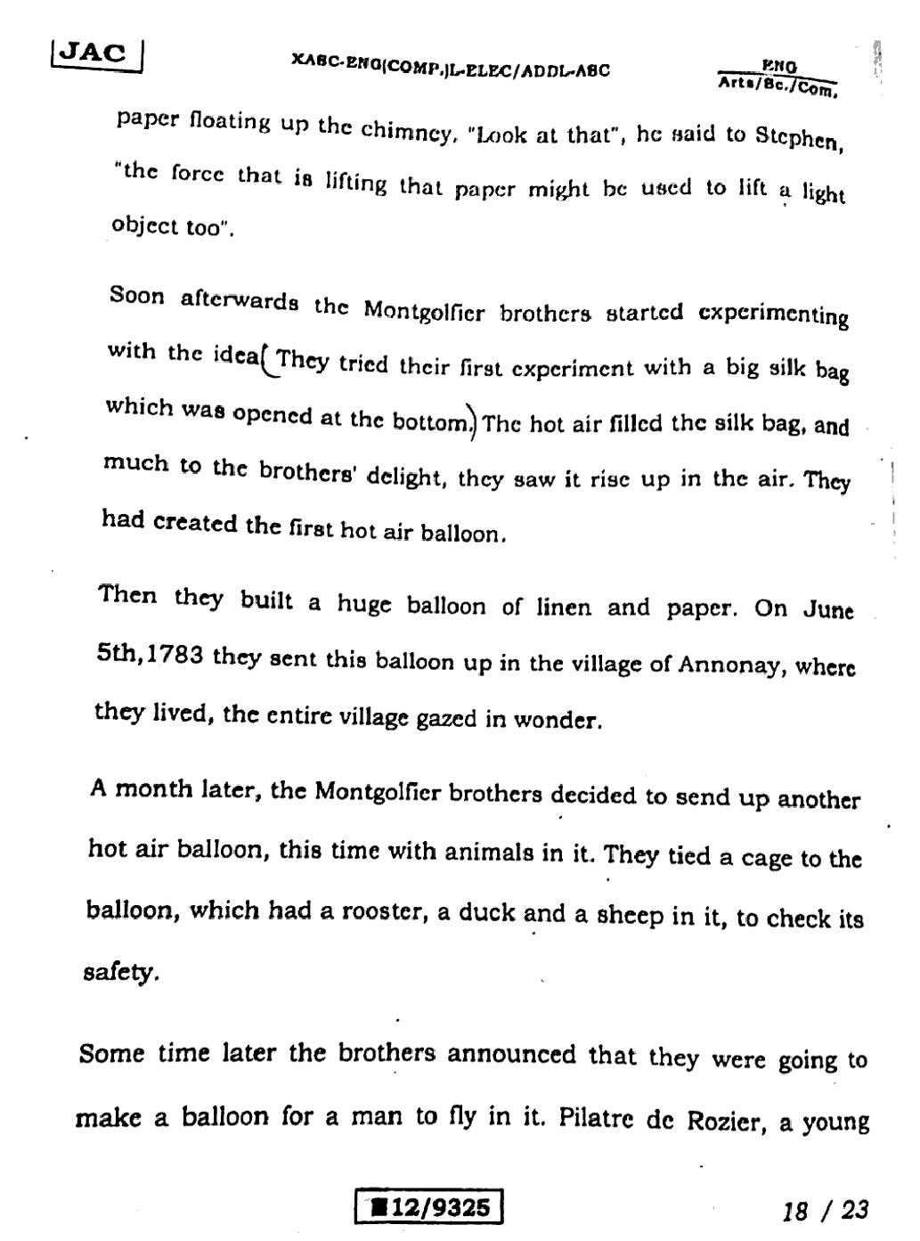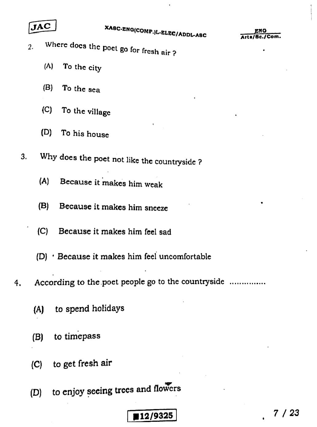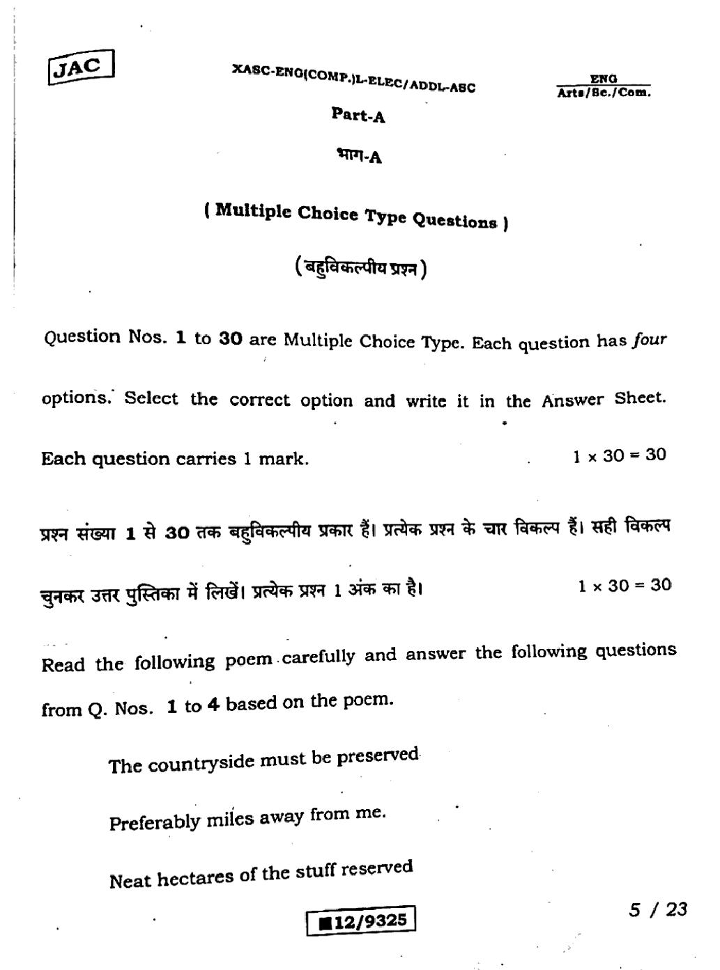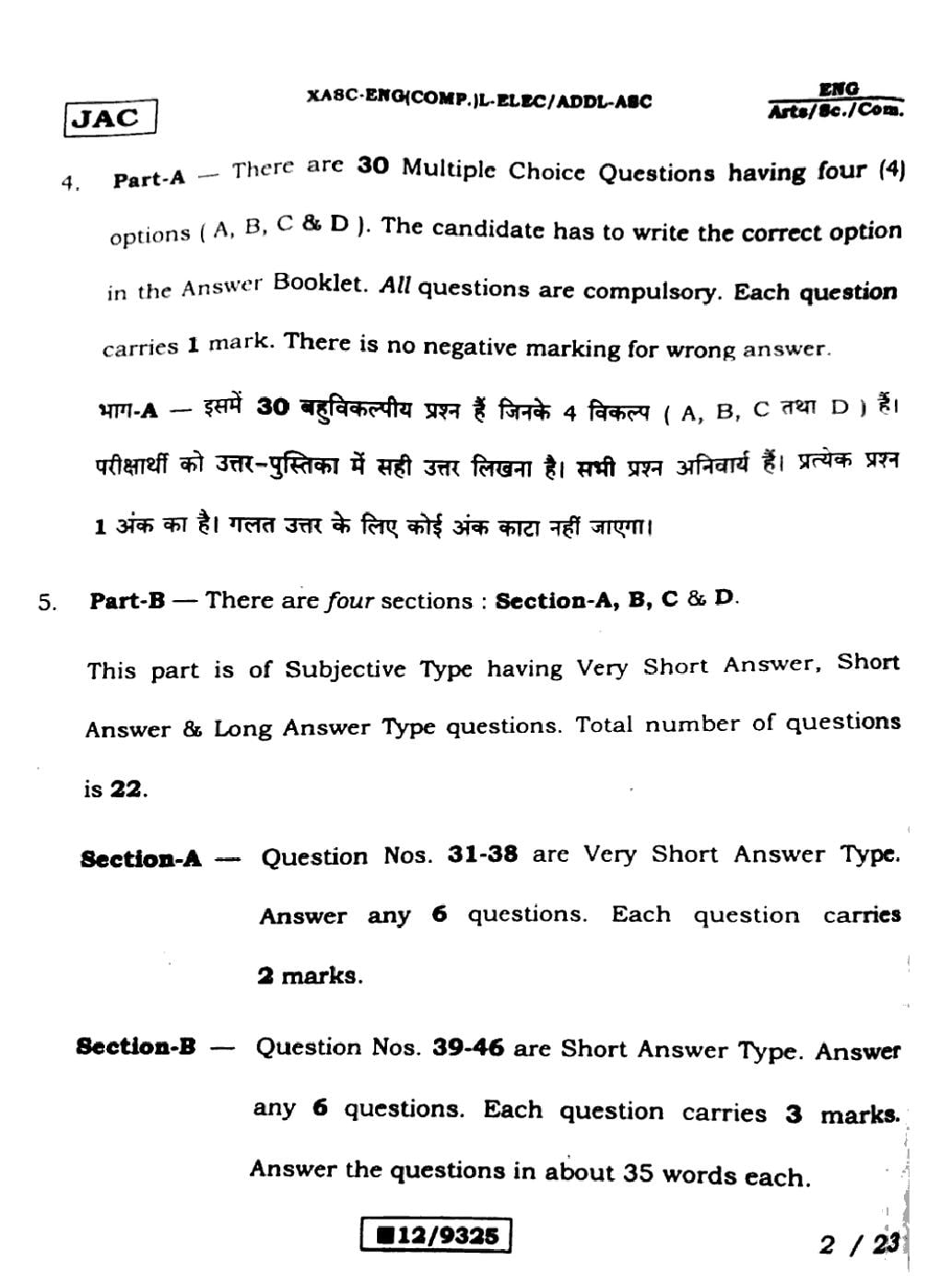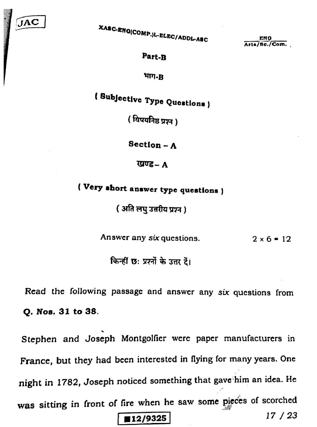 JAC Board Class 12 English (Arts) Previous Year Question Paper