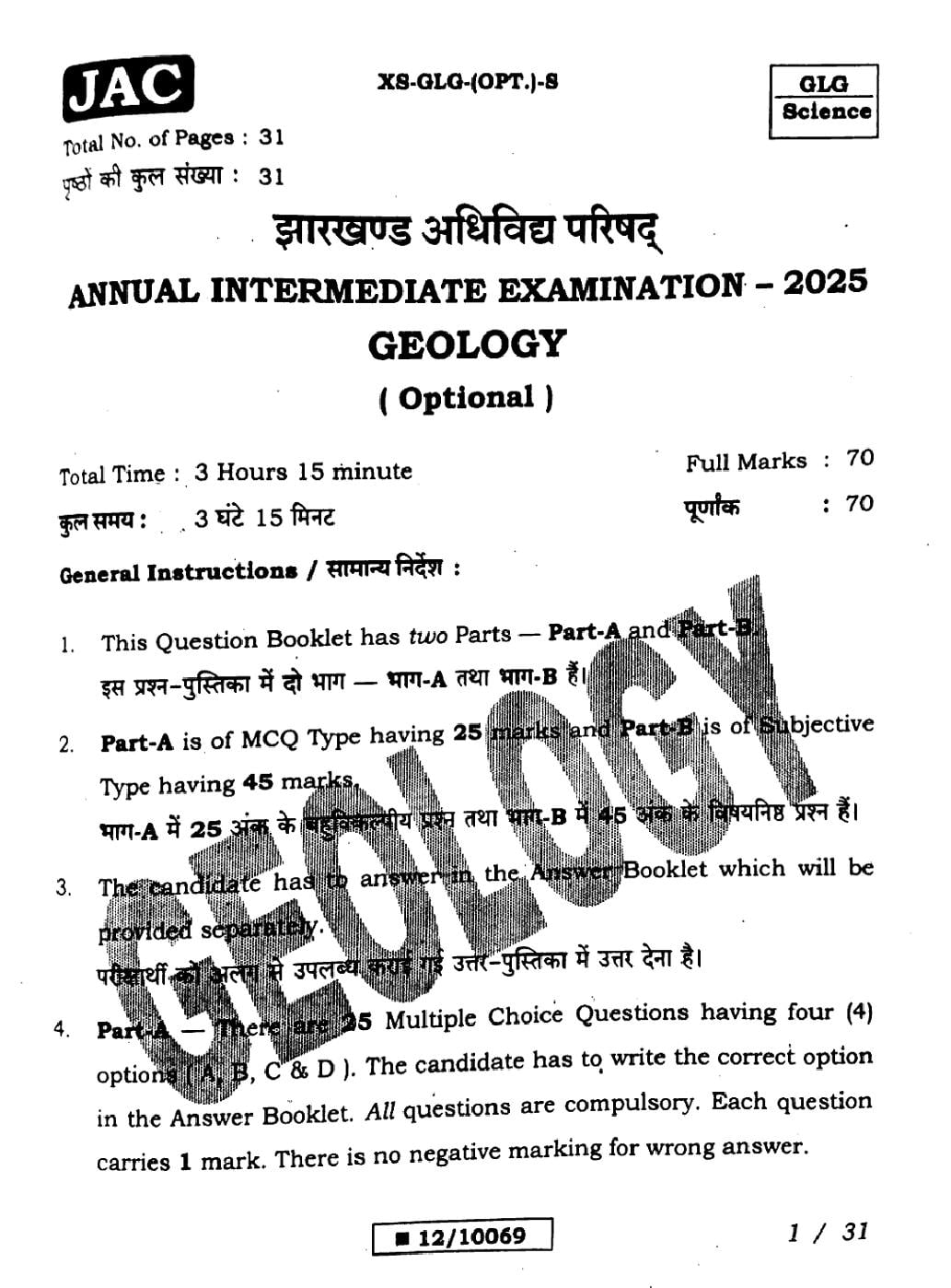 JAC Board Class 12 Question Paper 2025 Geology View Download