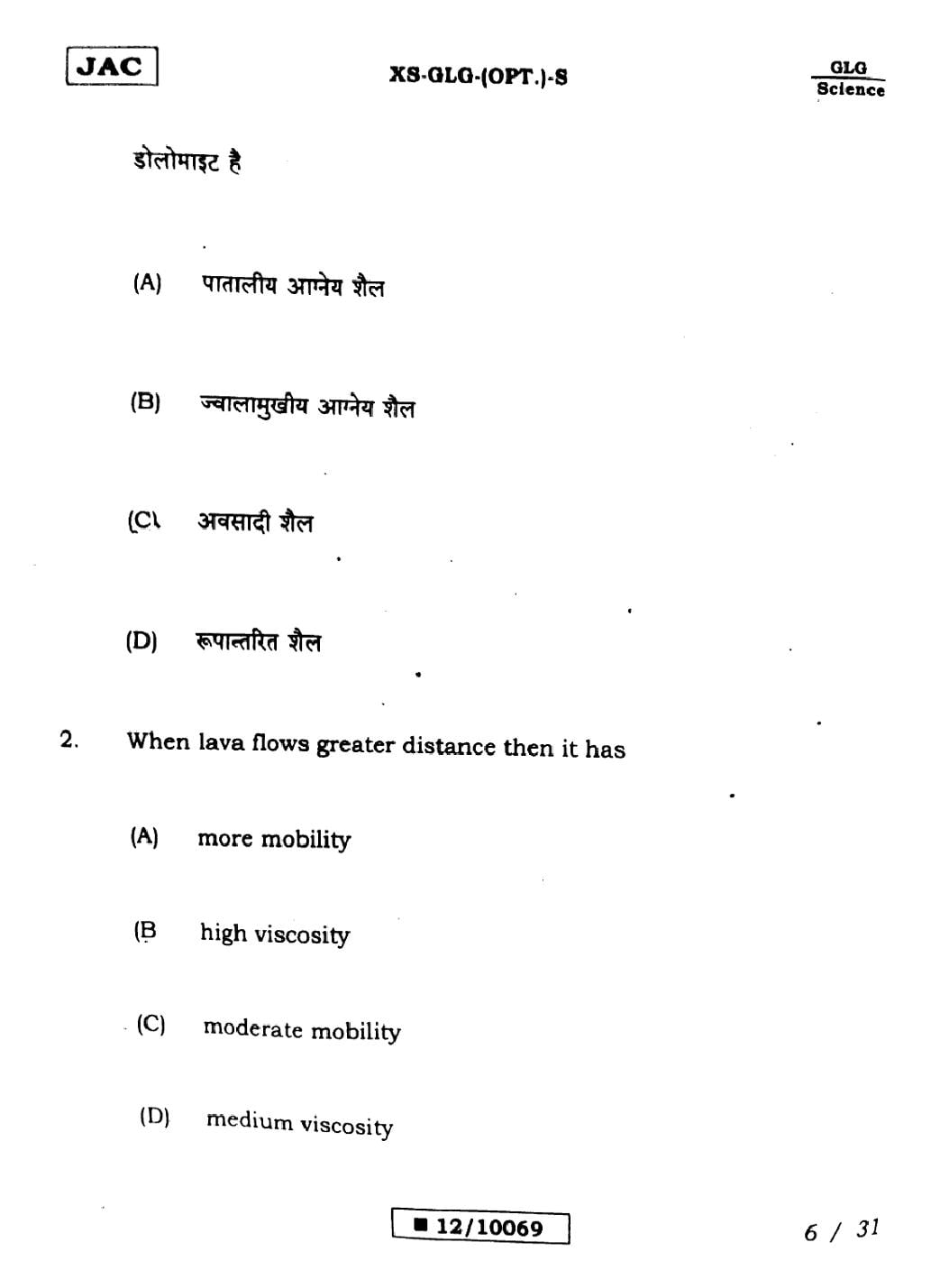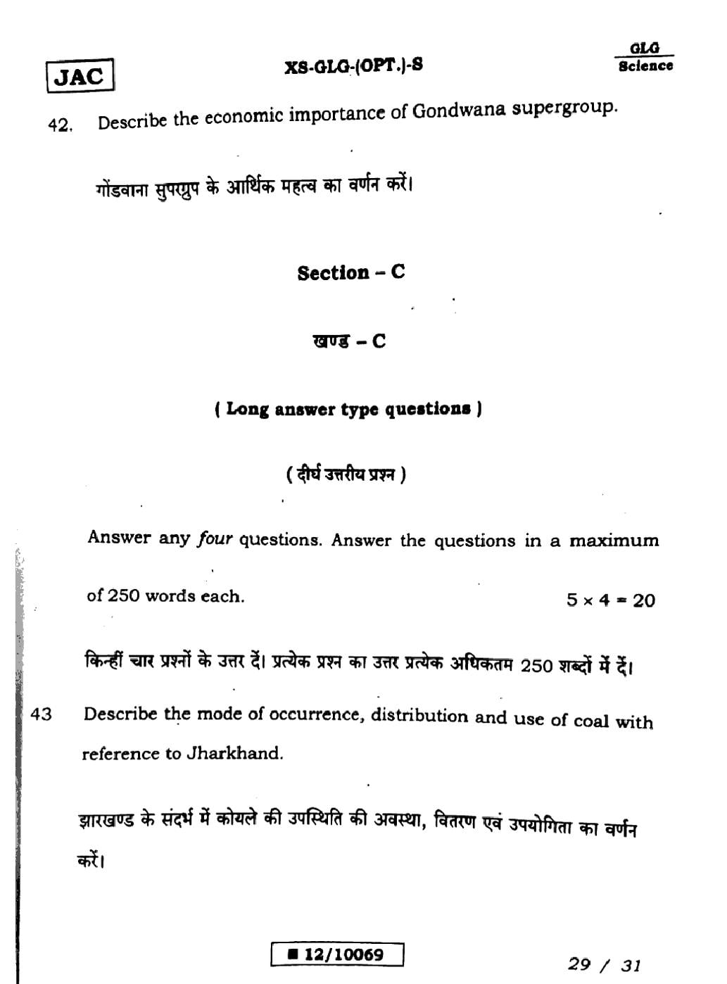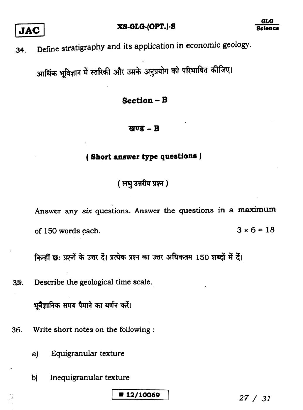 JAC Board Class 12 Geology Previous Year Question Paper