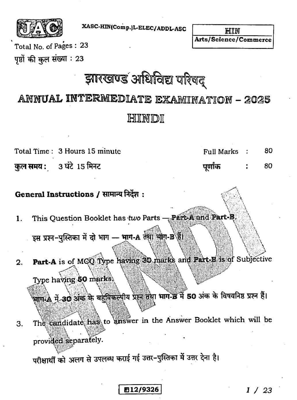 JAC Board Class 12 Question Paper 2024 Hindi View Download