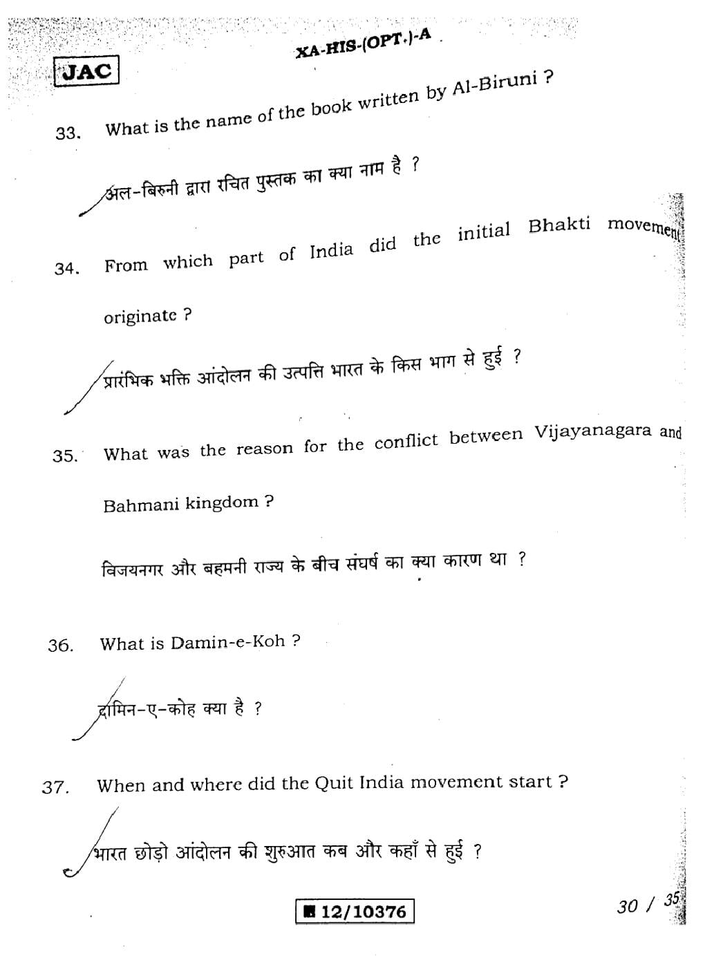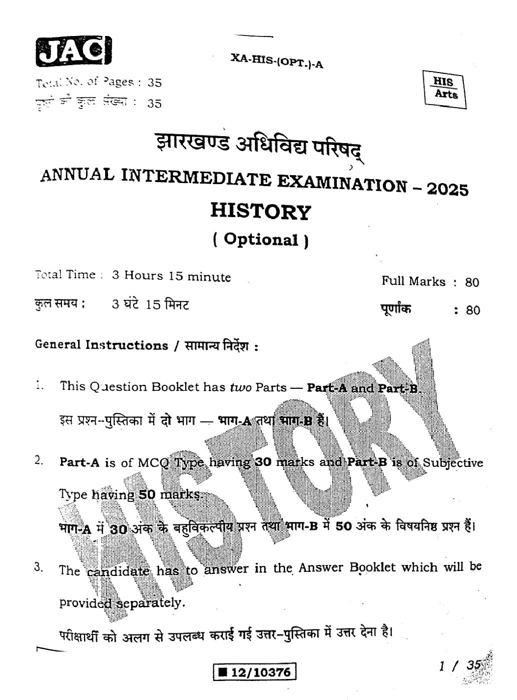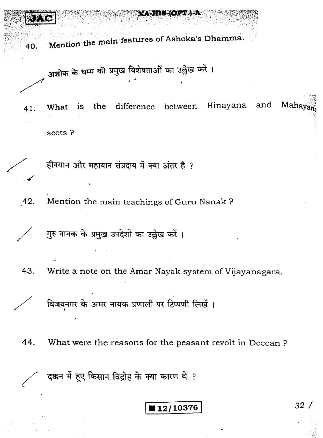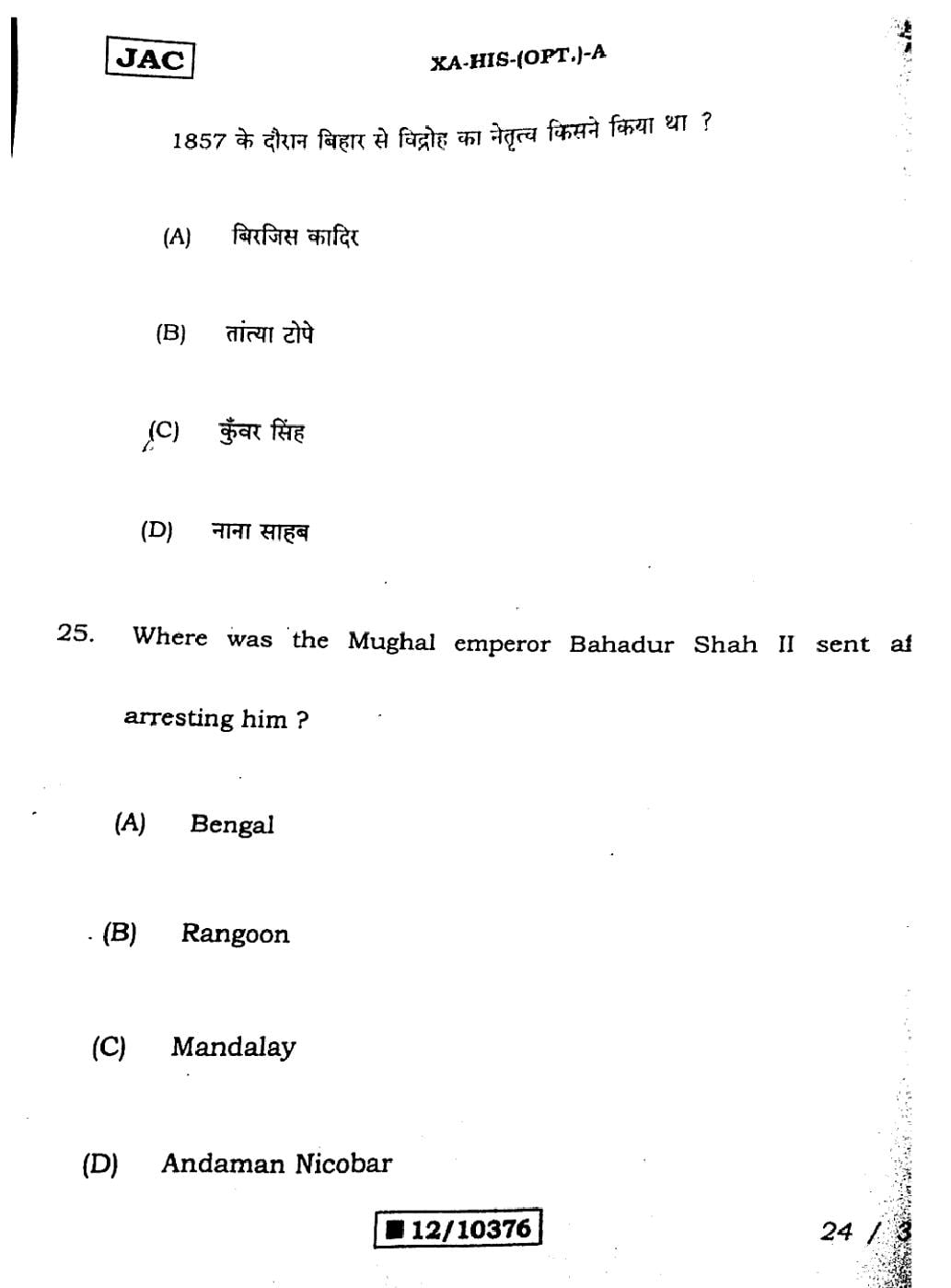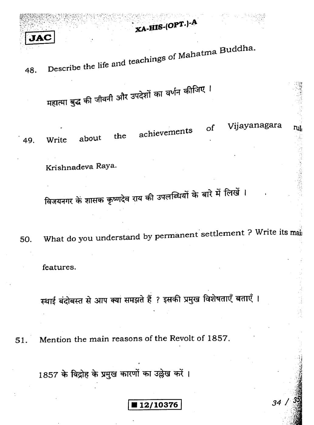 JAC Board Class 12 History Previous Year Question Paper PDF