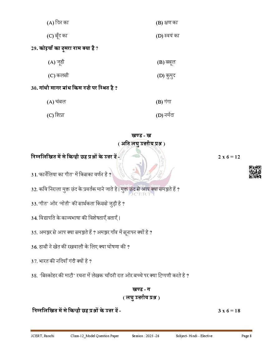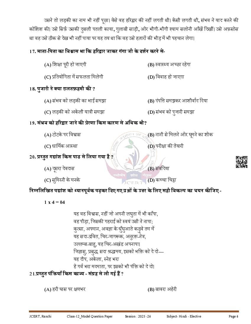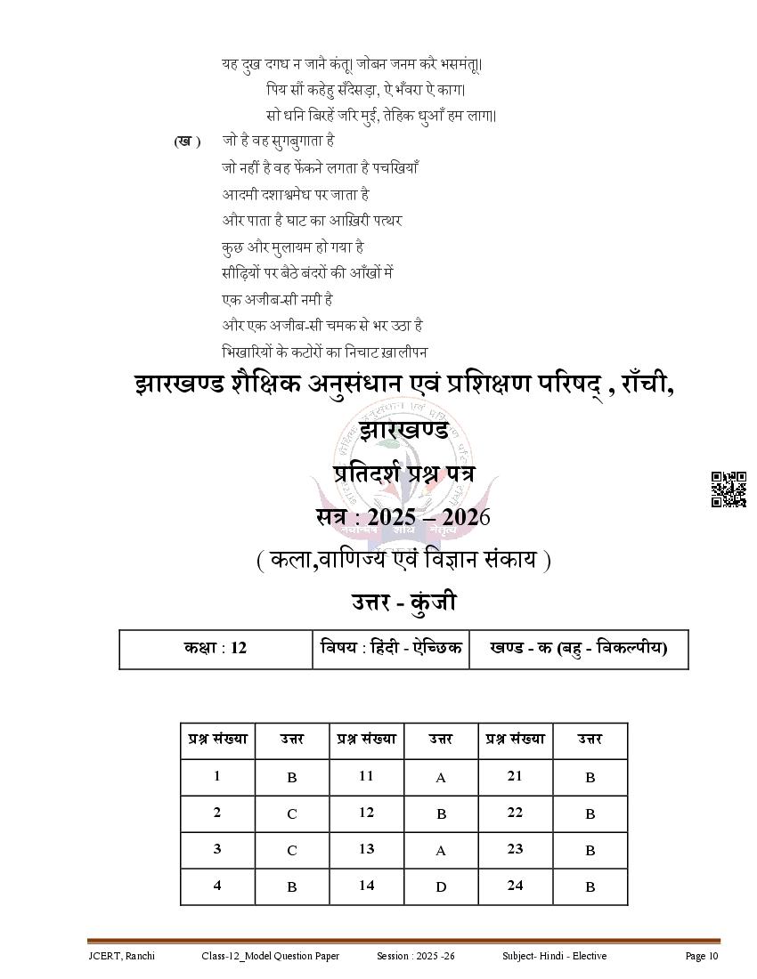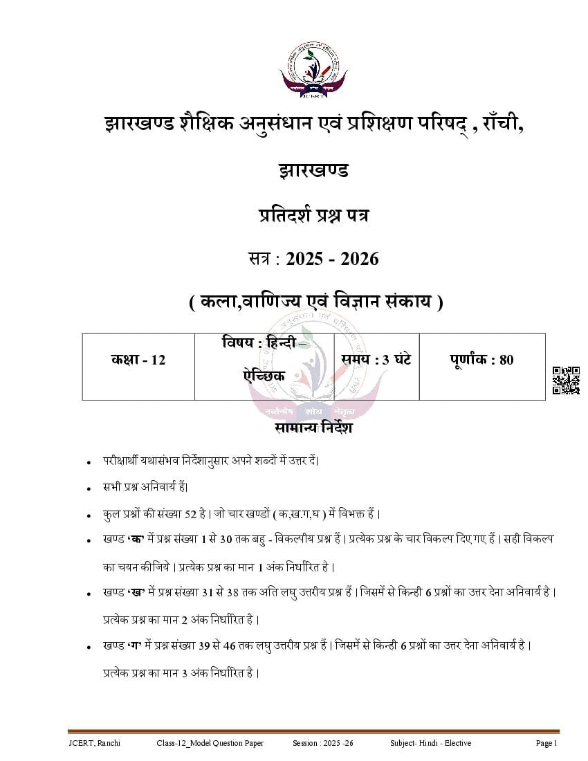 JAC Class 12 Model Question Paper 2026 Hindi Elective View Download