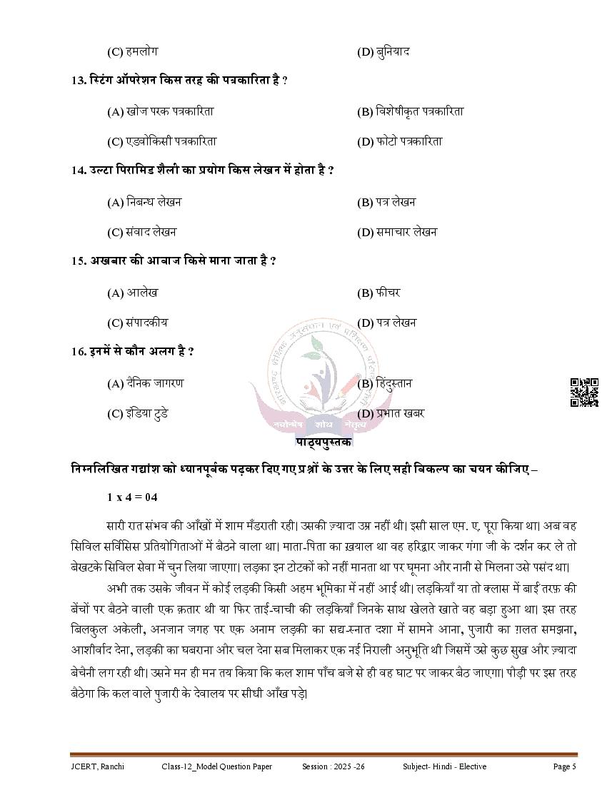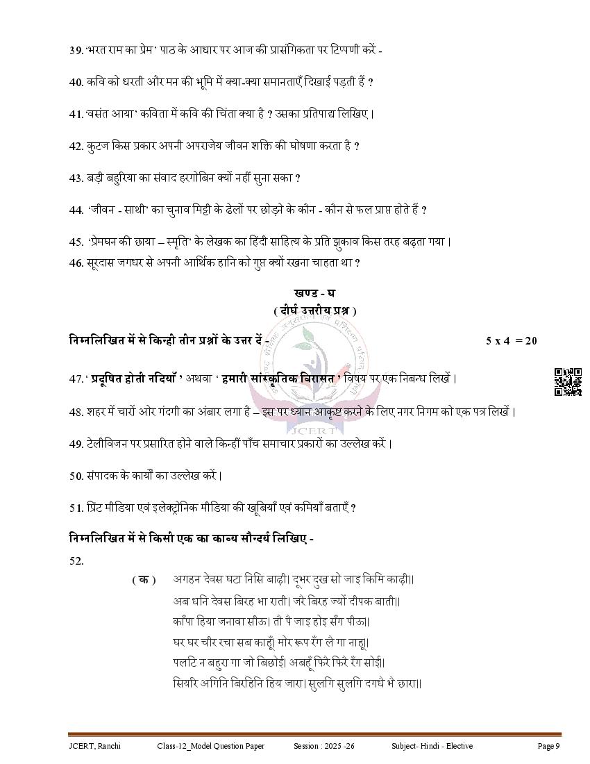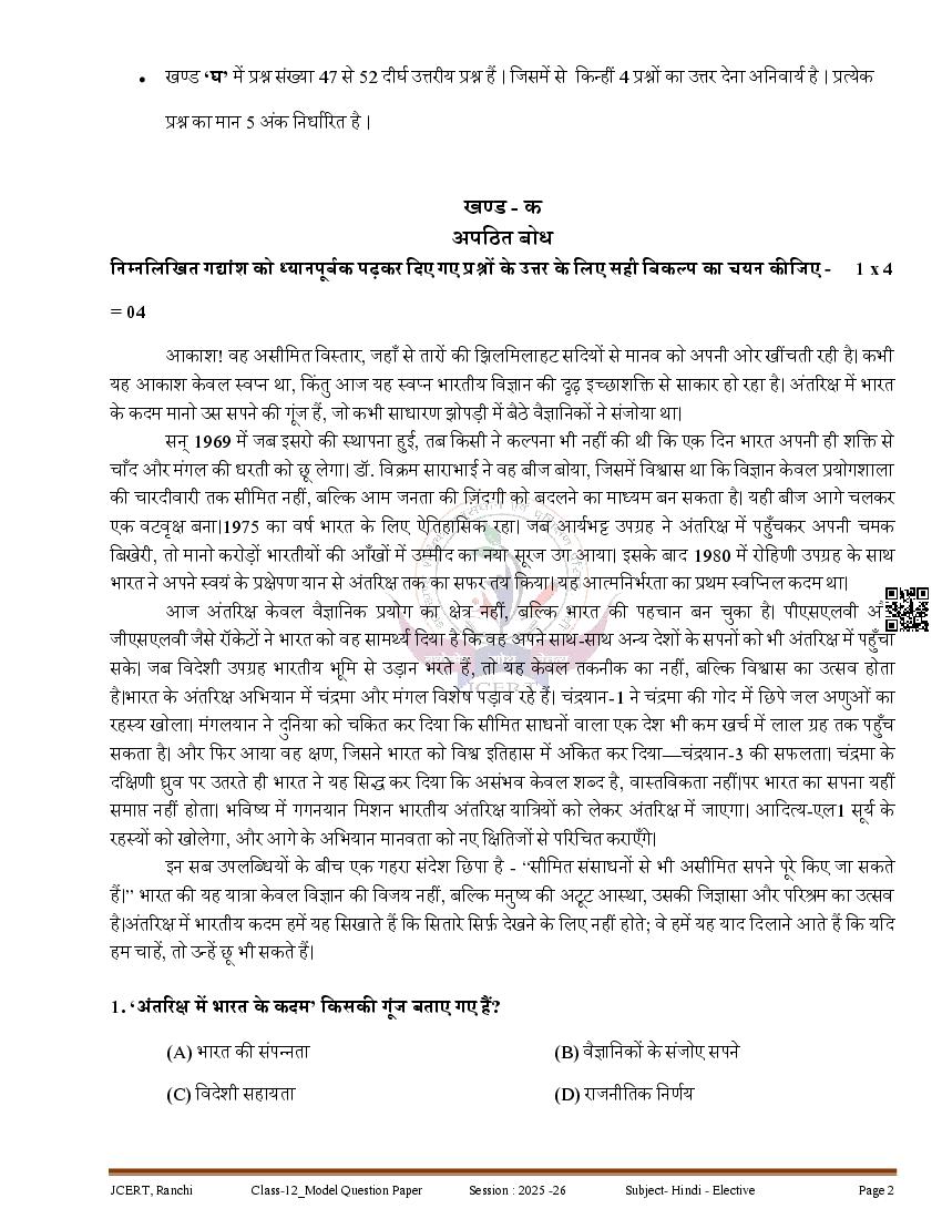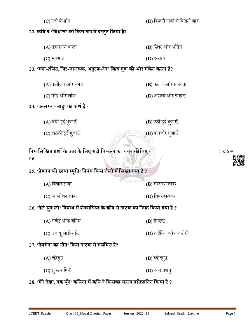 JAC Class 12 Model Question Paper 2026 Hindi Elective View Download