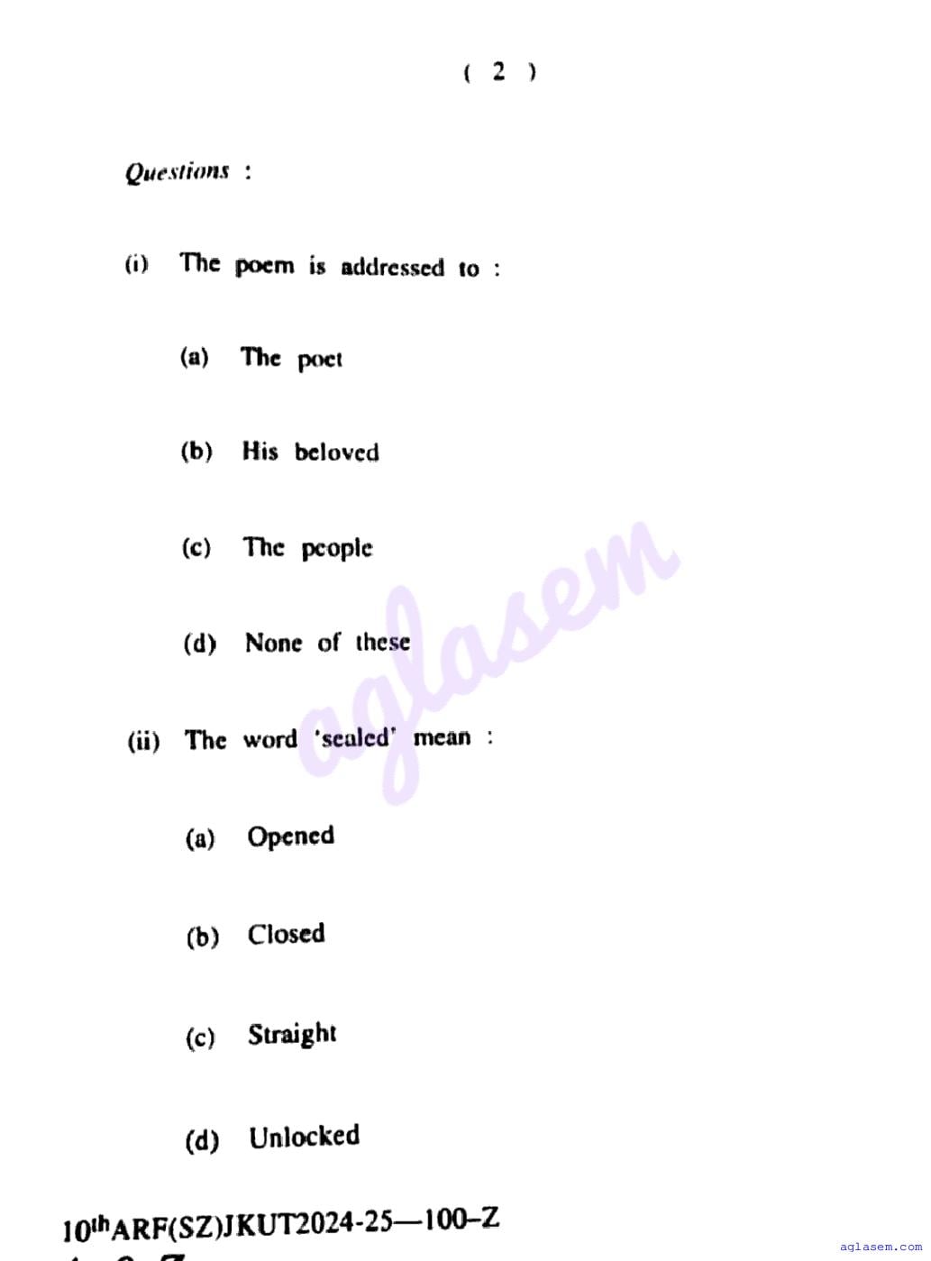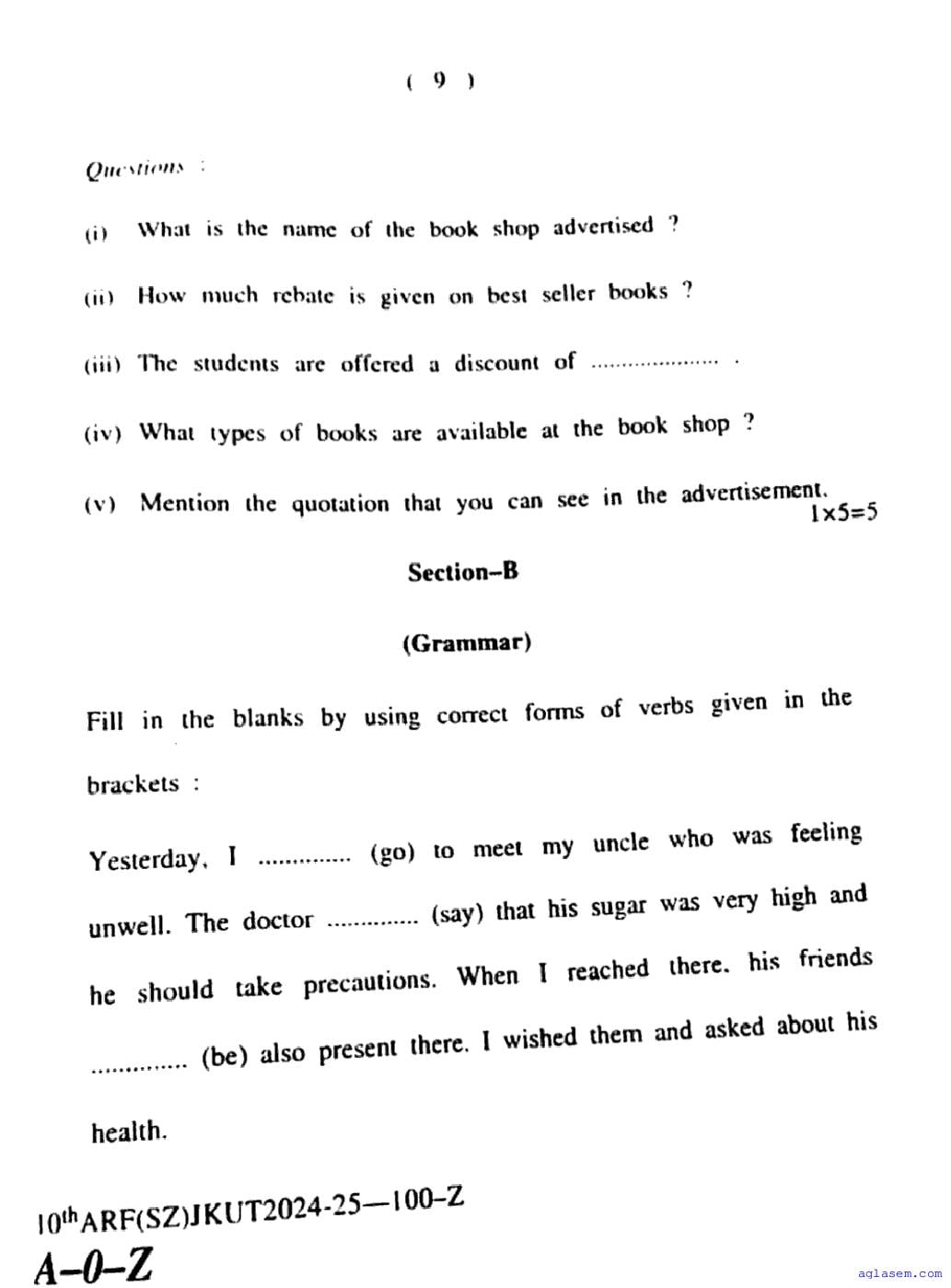 JKBOSE Class 10th Question Paper 2025 English View Download