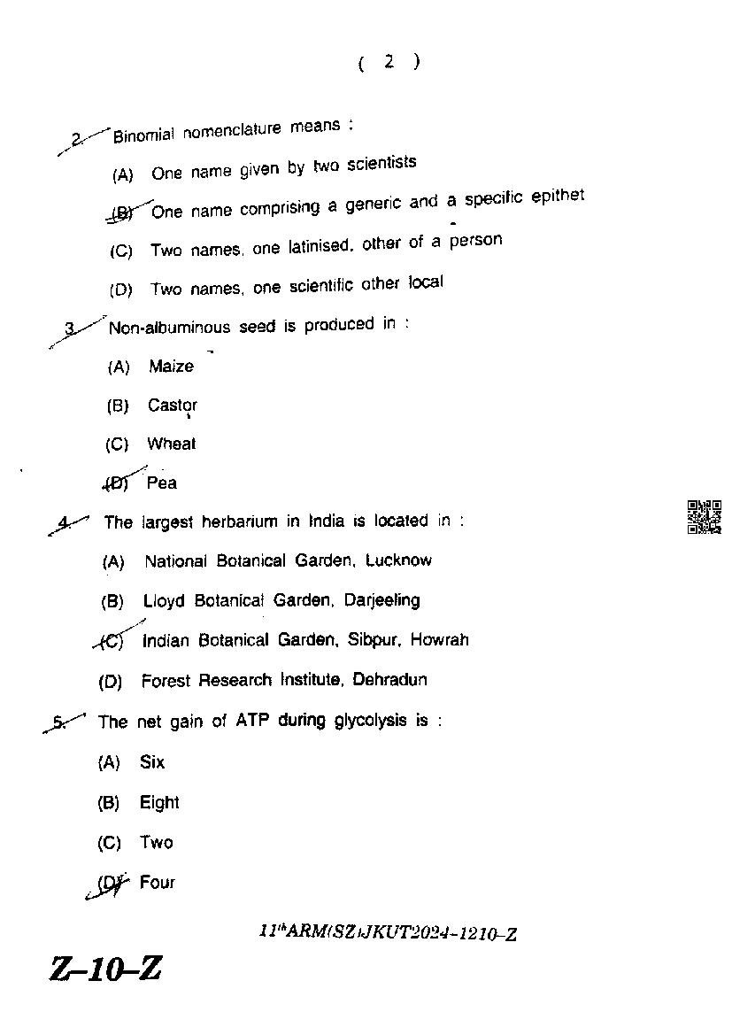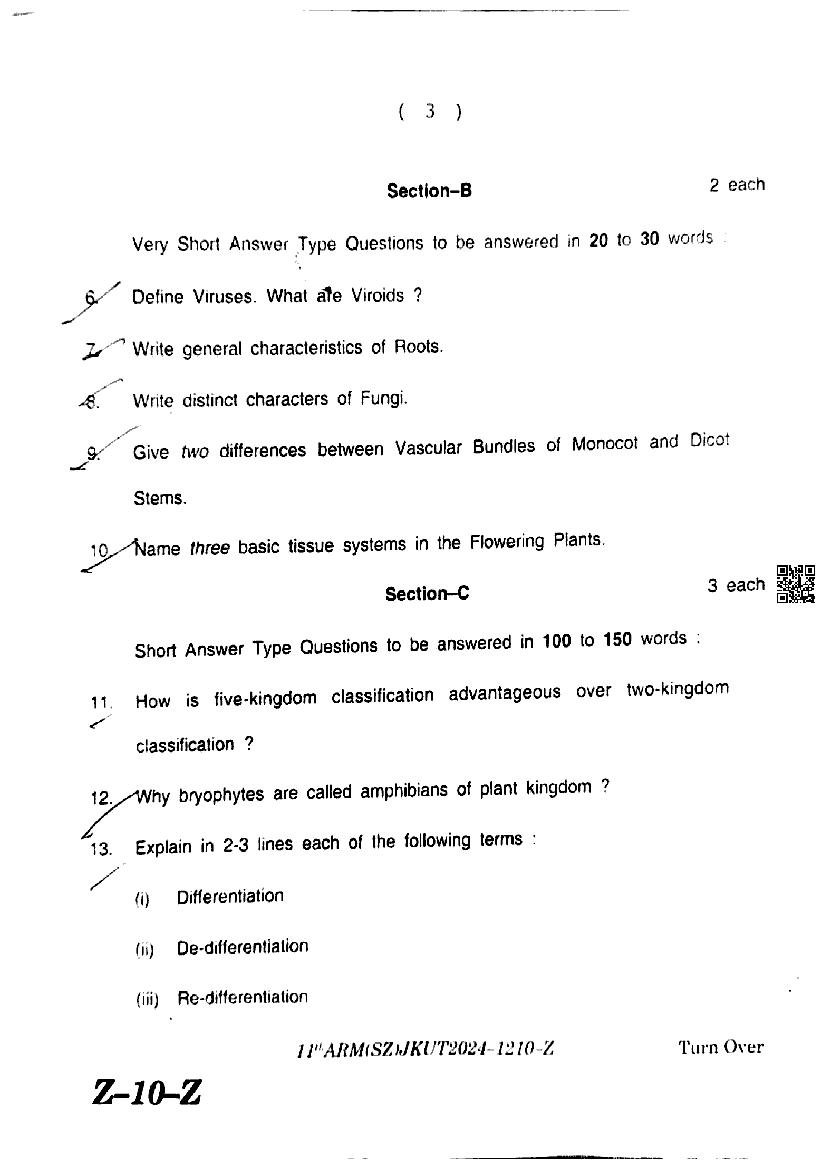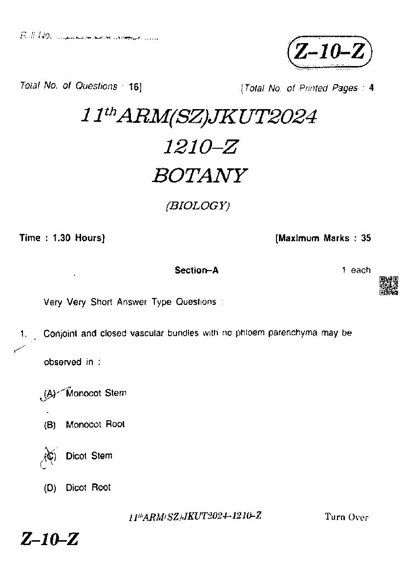 JKBOSE 11th Question Paper 2024 Biology Botany View Download