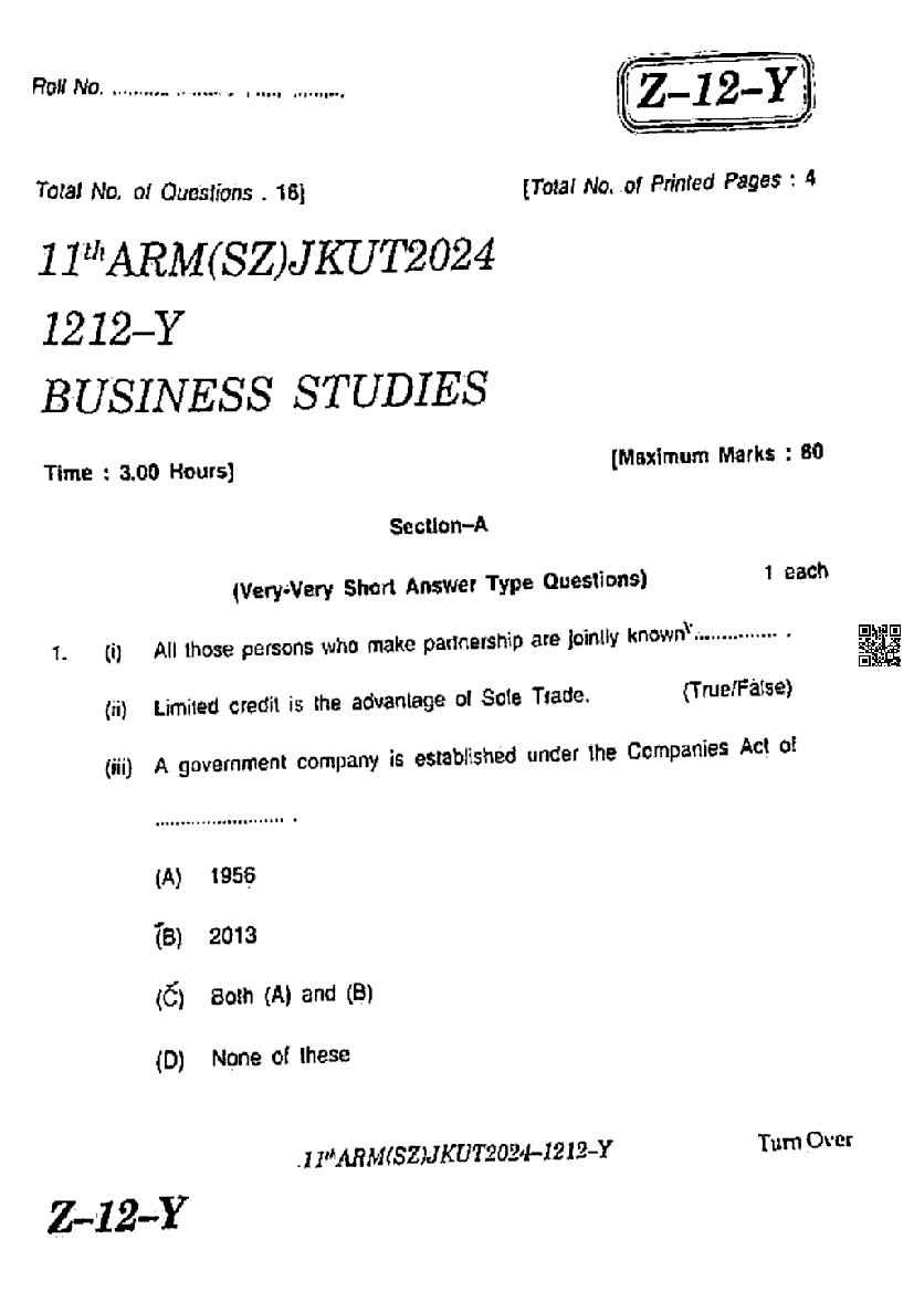 JKBOSE Class 11th Business Studies Question Paper PDF