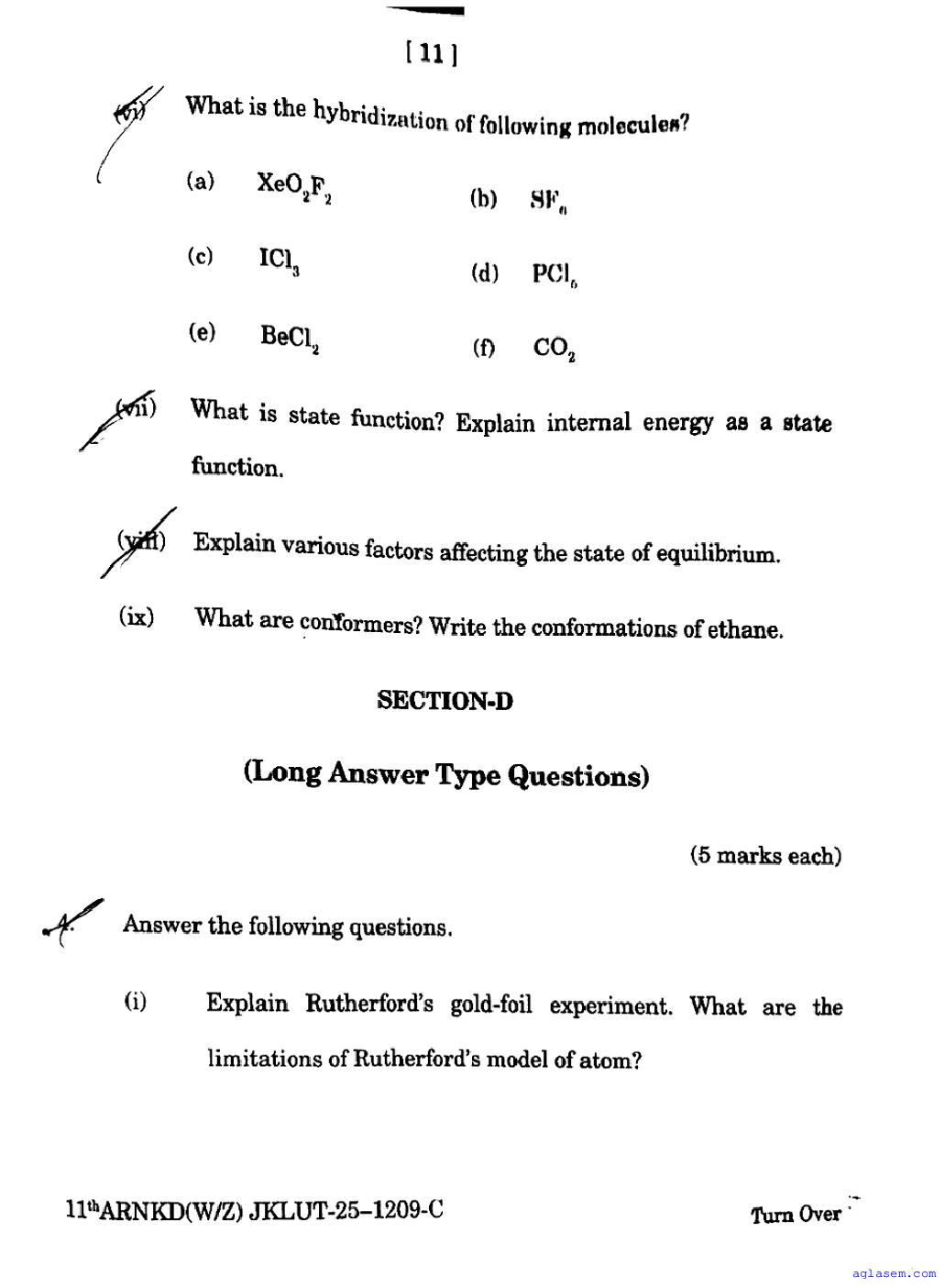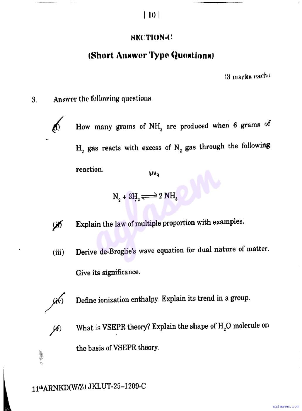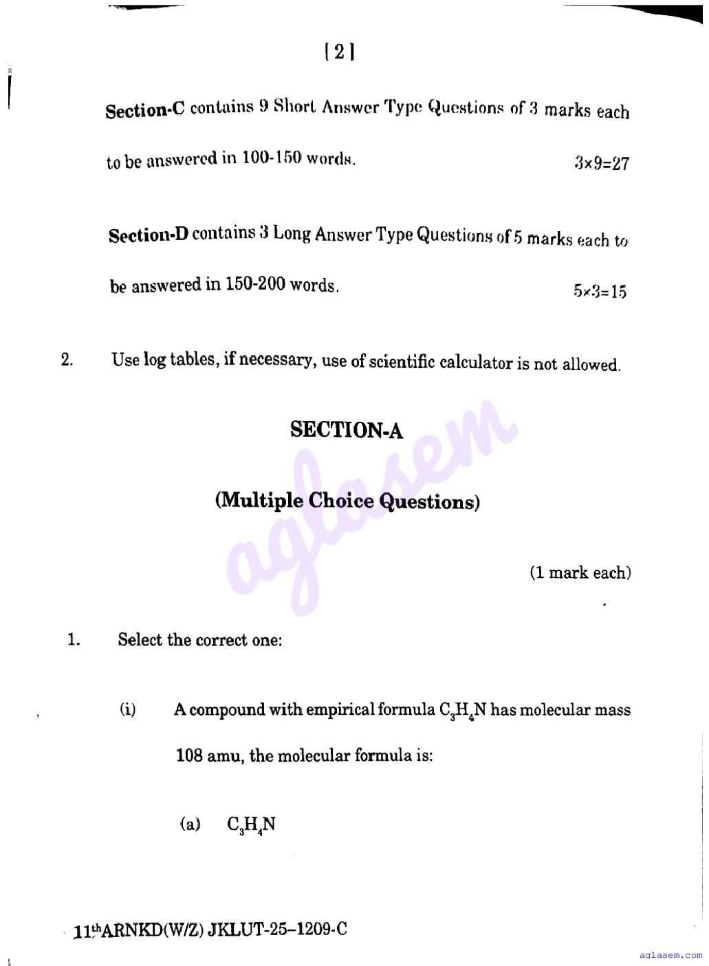 The JKBOSE question paper for class 11 Chemistry is as follows.