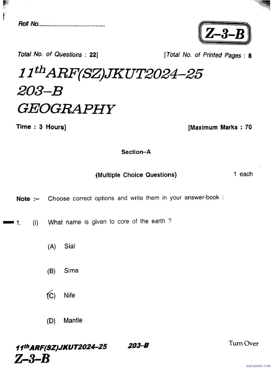 JKBOSE Class 11th Geography Question Paper
