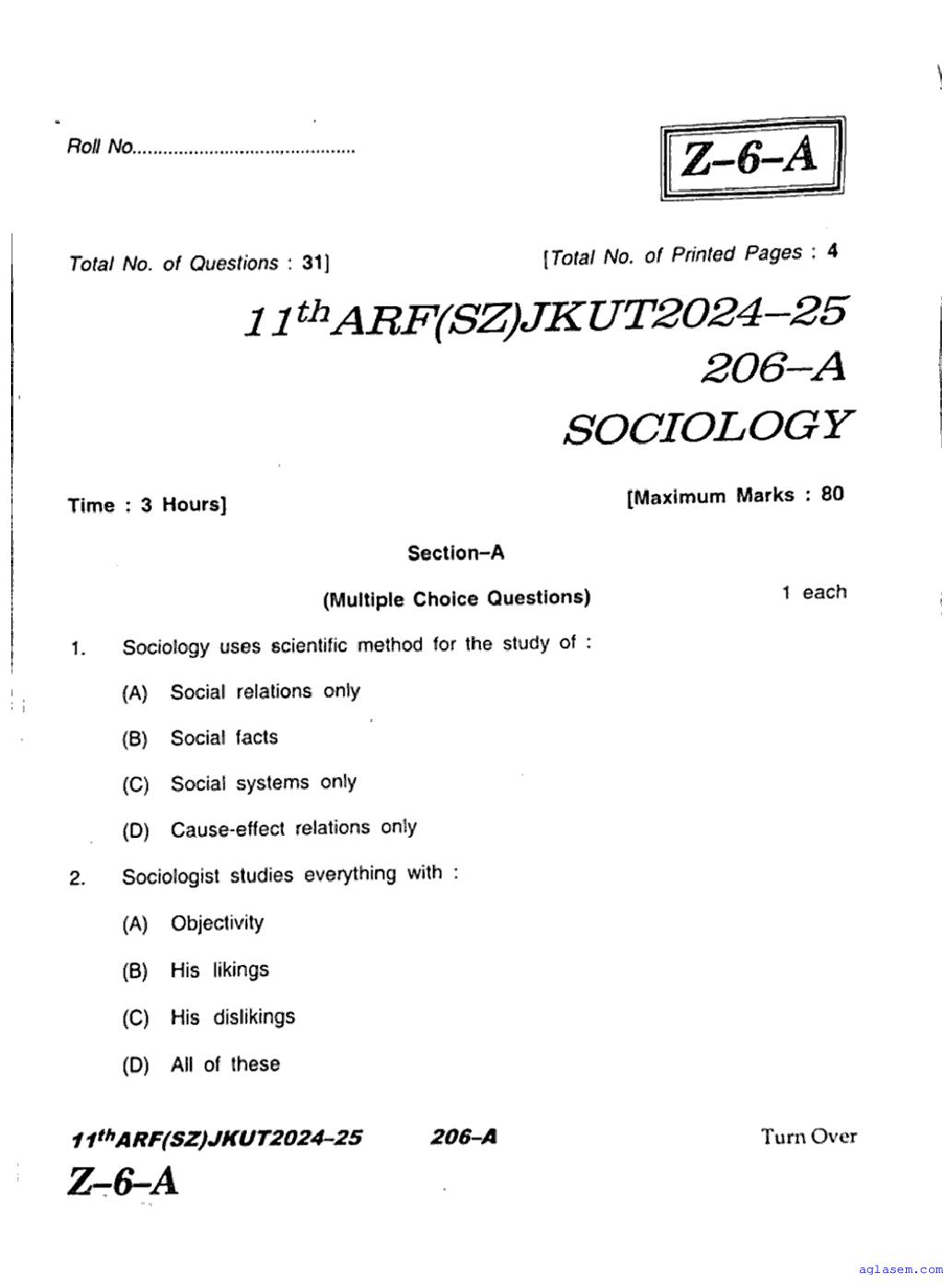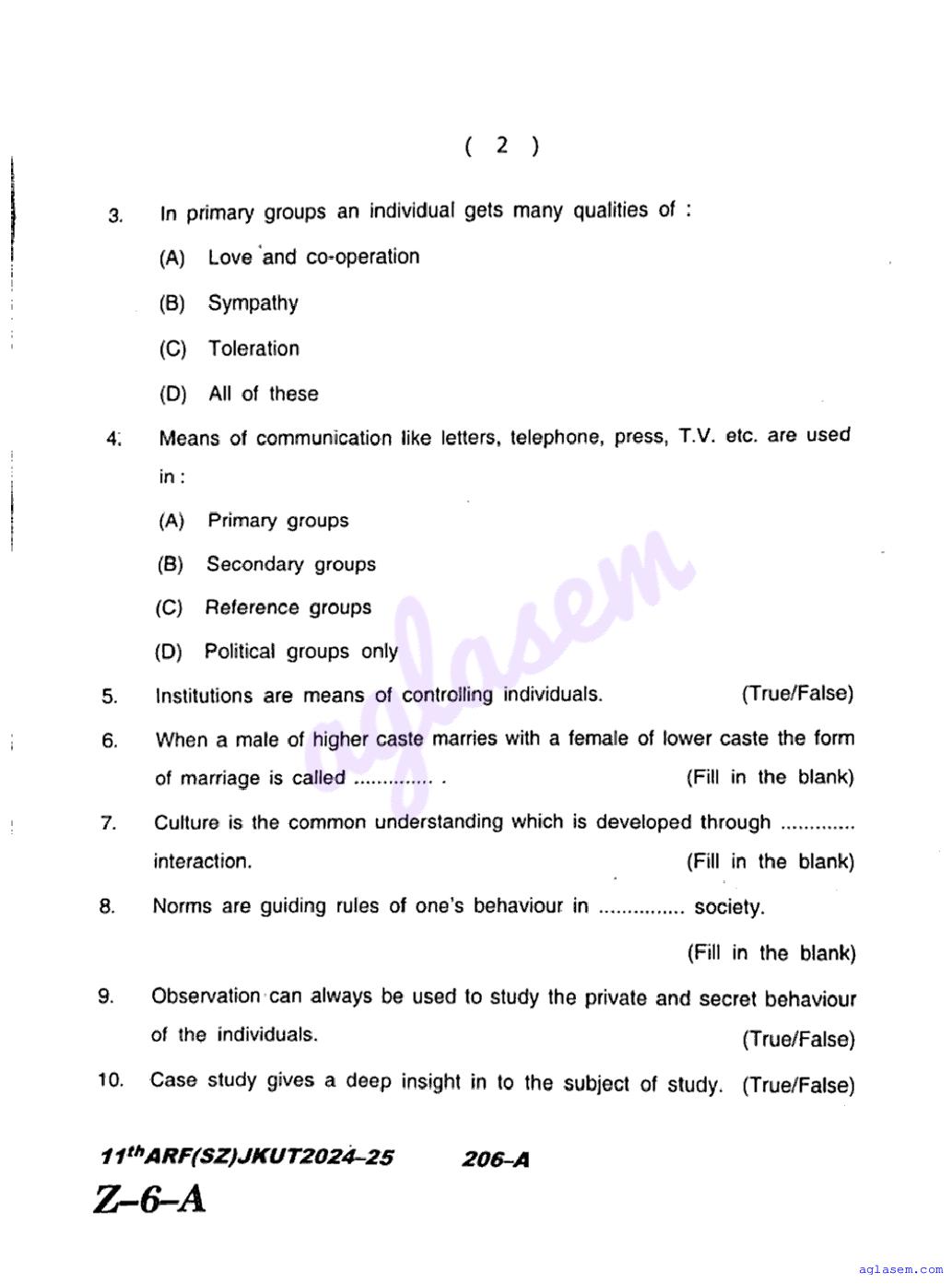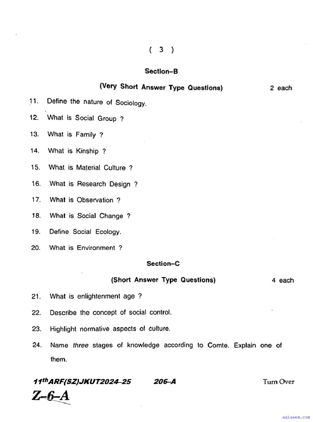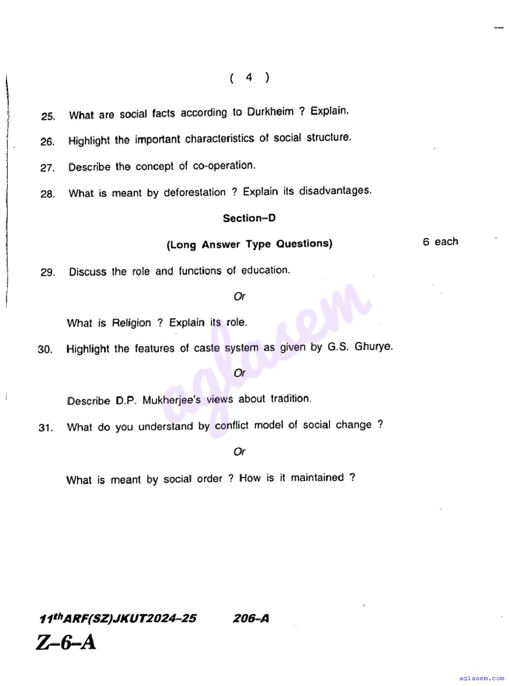 The JKBOSE question paper for class 11 Sociology is as follows.