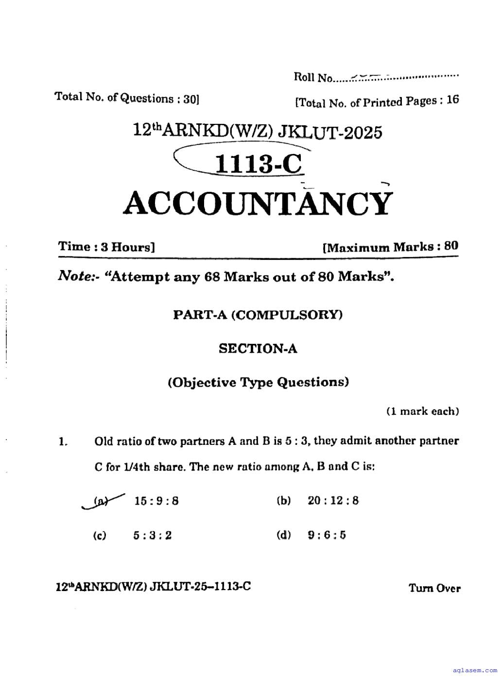 JKBOSE Class 12th Question Paper 2025 Accountancy View Download